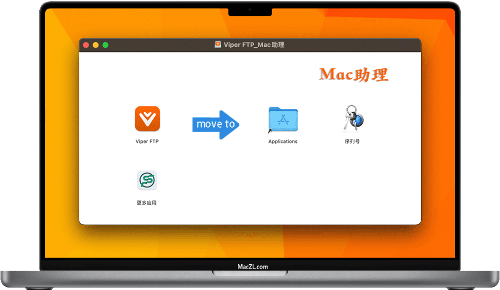 软件下载完成后,打开软件包如上图,拖动软件 Viper FTP 到 Applications 安装。