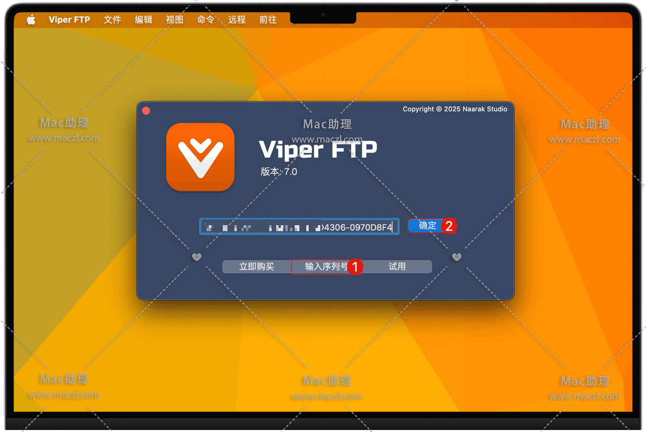 然后打开软件 Viper FTP,提示注册,点击“输入序列号(Enter Serial Number)”。复制软件包中的序列号,粘贴到软件注册页面,然后点击“确定(OK)”按钮,如下图。