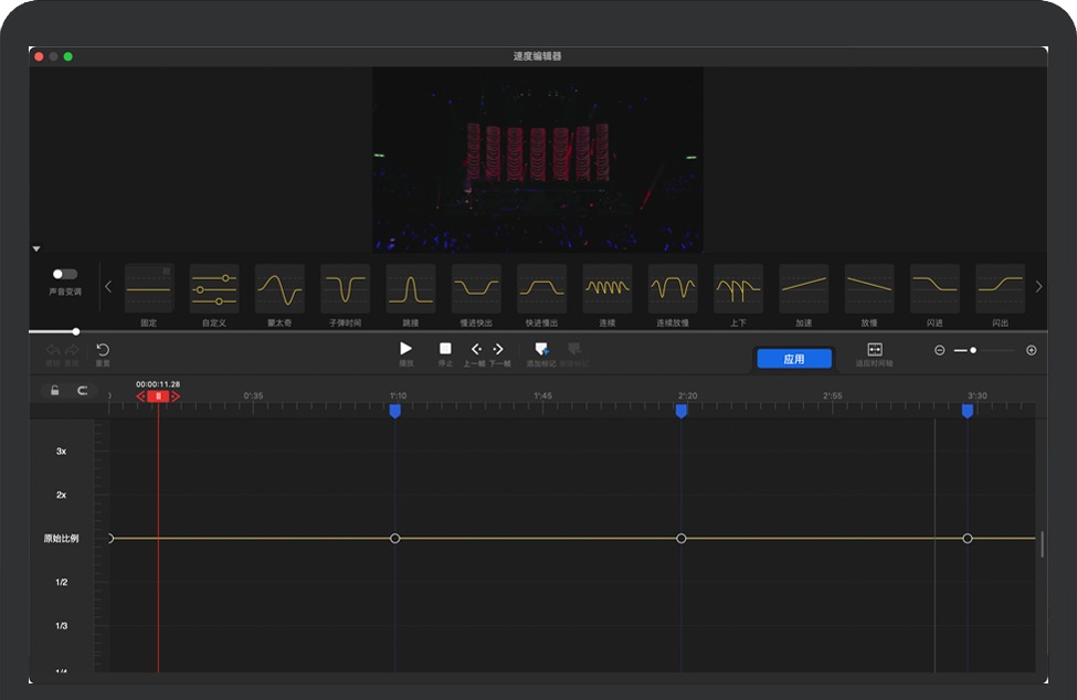 速度变化有两种类型,“正常”和“曲线”。“普通”可以以双倍速度或慢速播放。“曲线”可以通过“快⇒慢”和“慢⇒快”等动作来改变速度。