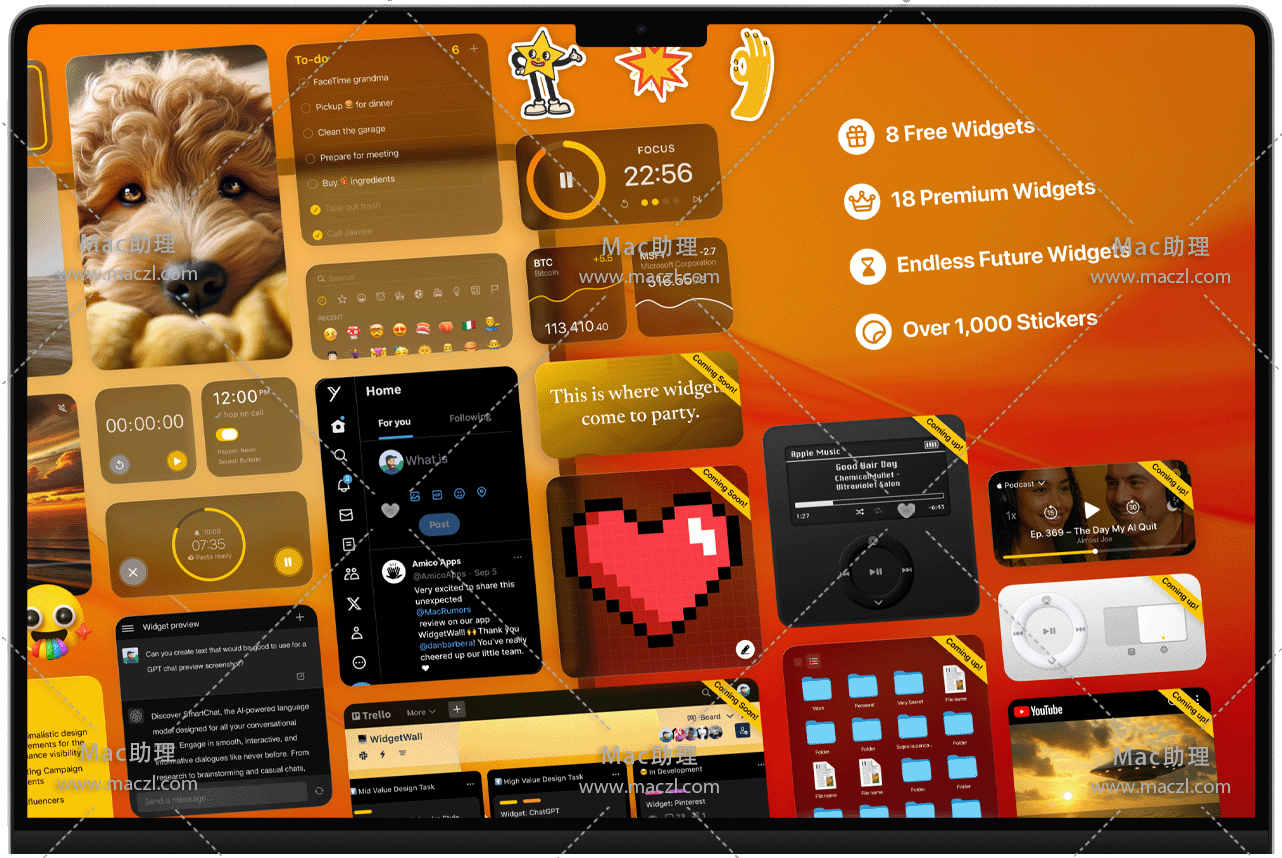 WidgetWall 应用内置的小组件功能强大,足以作为独立的 macOS 应用使用。在这里,您可以找到番茄钟计时器、背景白噪音、记忆游戏、镜子、倒计时器、CPU、内存和硬盘统计信息、便签和贴纸。