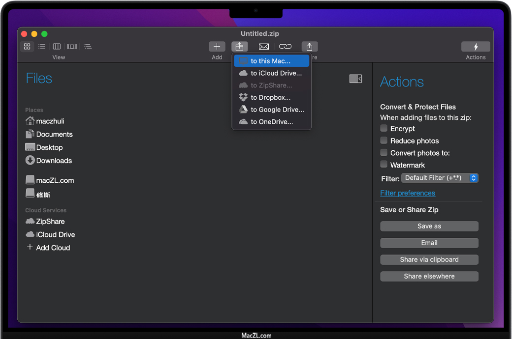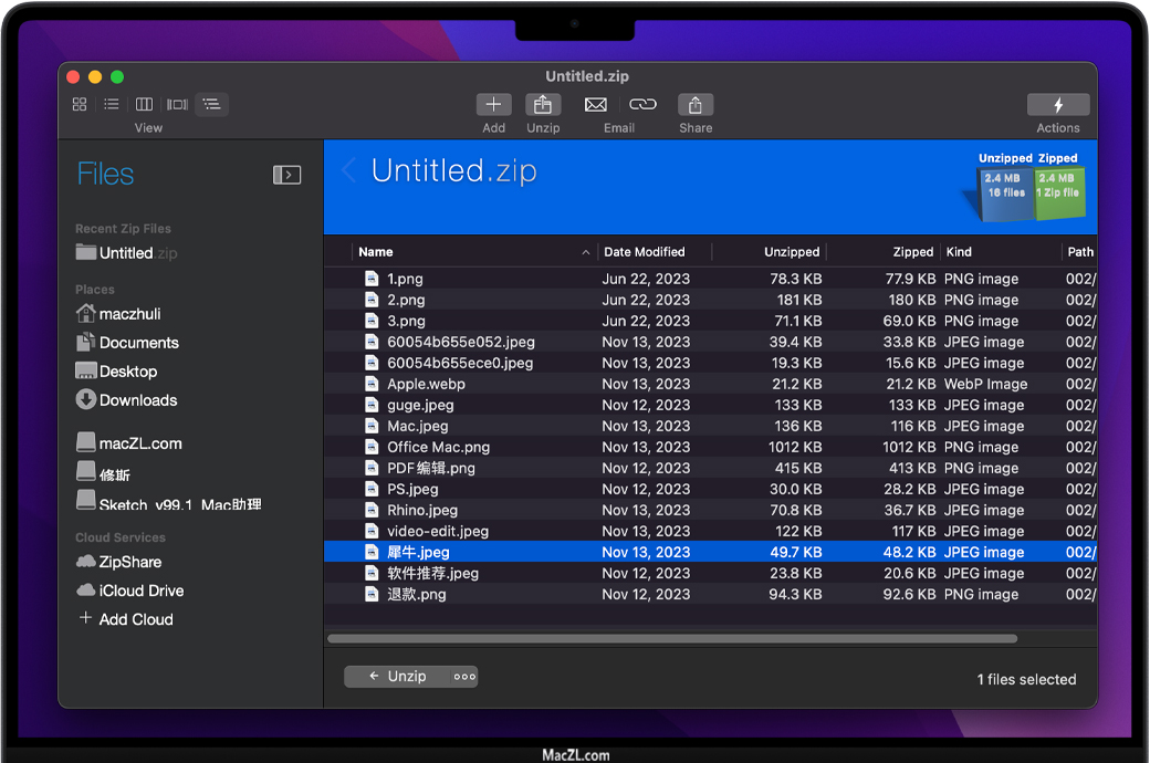 只需将文件从Mac复制并粘贴到Zip或Zipx文件。这一快速步骤允许您在从文件夹复制文件并粘贴到Zip文件、复制文件和文件夹结构时,透明地管理要添加到Zip中的内容。