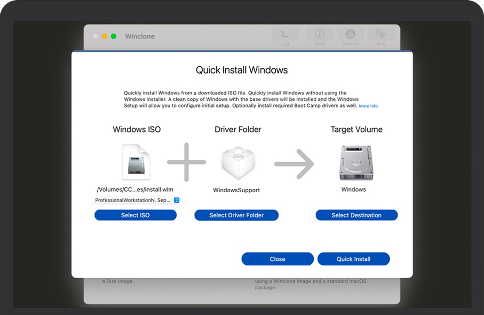只需选择一个Windows ISO、一个驱动程序文件夹和一个目标卷:只需几分钟,Winclone 10就会完成安装。