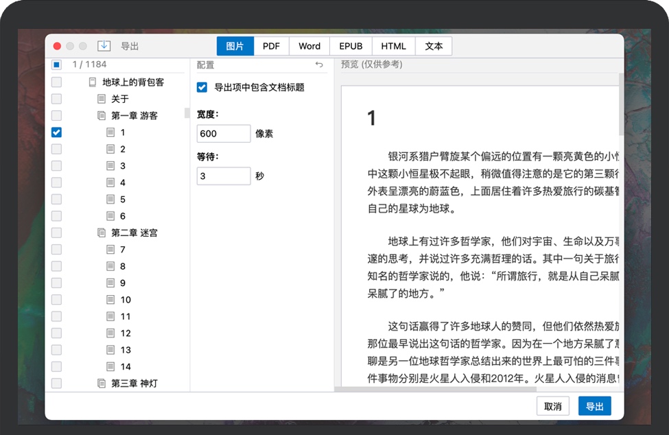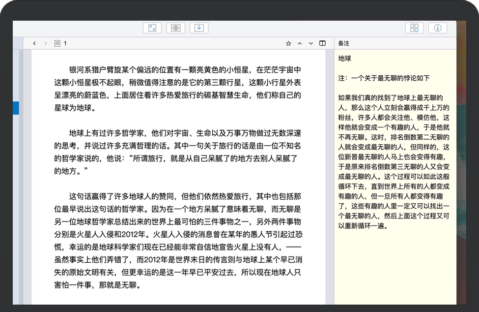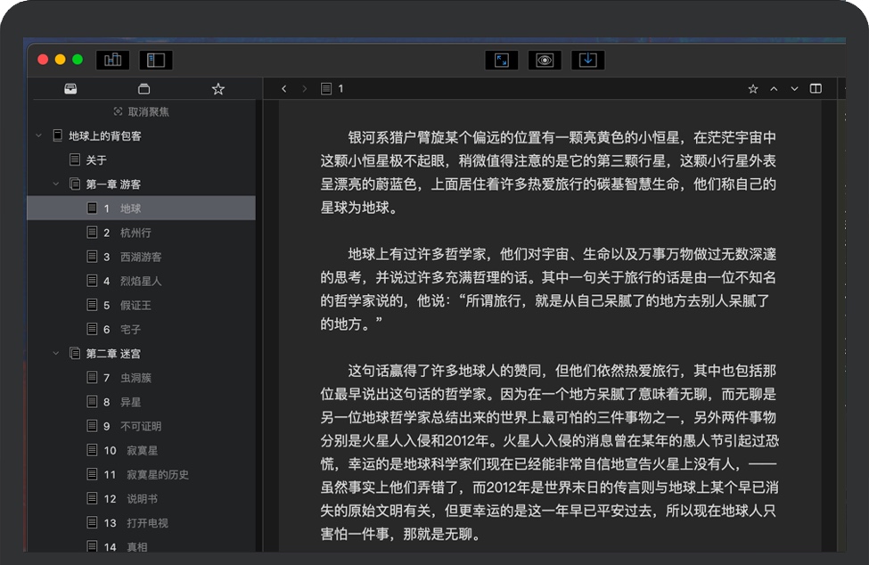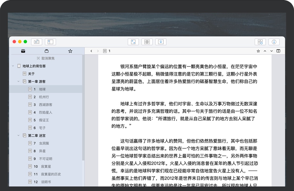 目录树「妙笔」采用树状目录来组织文档,因此非常适合长篇写作。你可以从上到下完成作品,也可以先在目录处组织好写作大纲,再逐一完善。 目录可以非常方便地调整缩进,也可以拖拽以便排序。 文档备注写作过程中,你可能需要添加一些备注,但又不想在最终输出的文档中显示这些备注,这时,就可以将这些备注信息放在右则的备注栏中。 导出为多种格式「妙笔」支持导出为多种格式,包括图片(PNG)、PDF、Word、文本、网页等。 导出时,可以选择只导出当前选中的节点,还是包含其子节点。 |