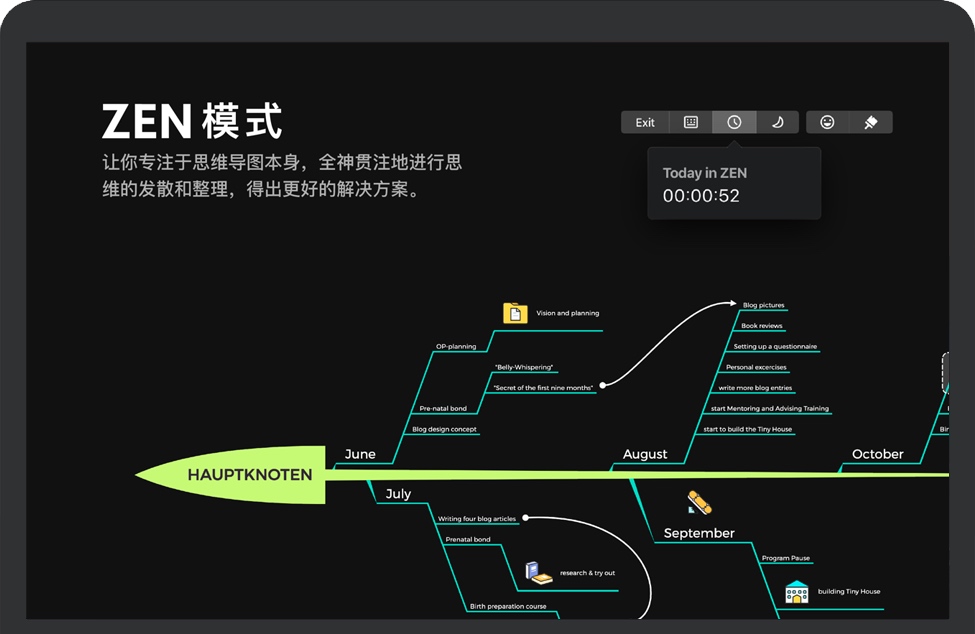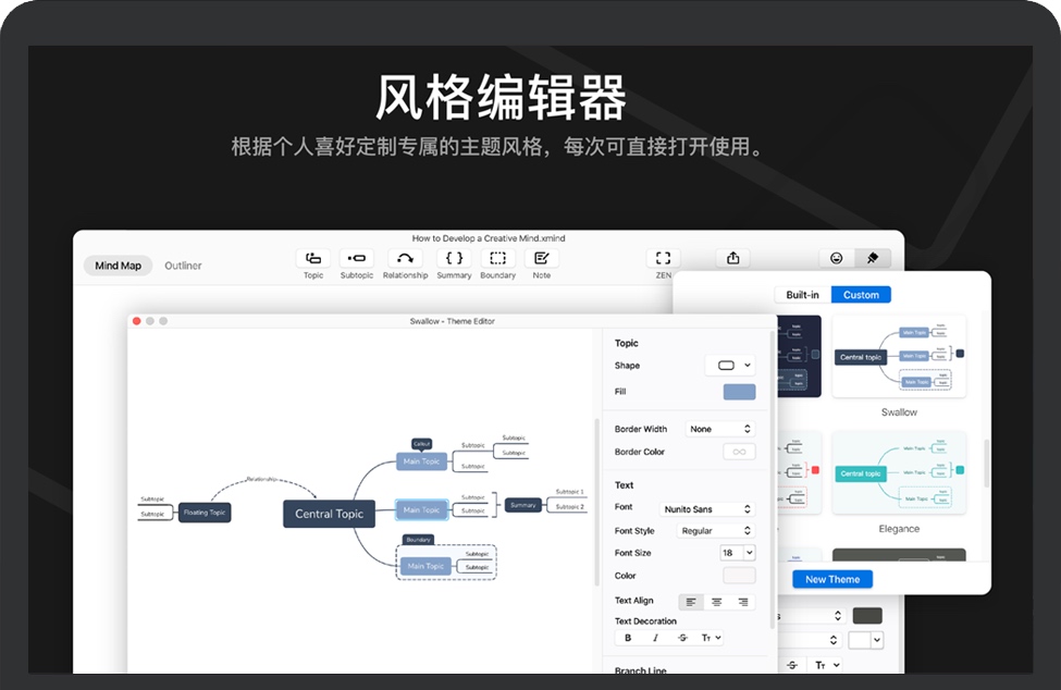 在细节处精心雕琢的全新界面风格,美观优雅,轻巧动人。适应起来毫不费劲,却又耳目一新。无边界的设计风格减少了视觉干扰,让你更沉浸于思维导图的绘制中。
