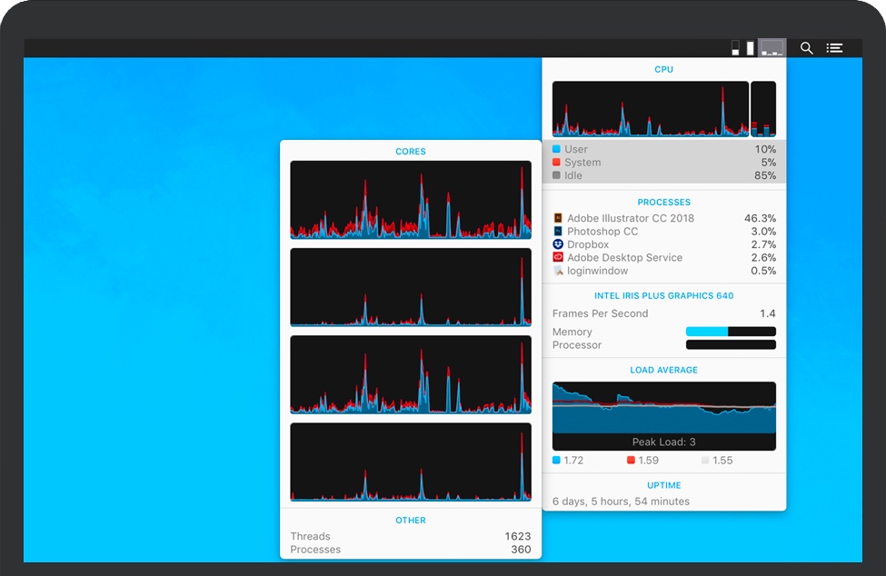高度详细的CPU信息,包括各个内核的当前使用情况,历史记录图,平均负载,正常运行时间,CPU频率以及使用最多CPU的应用程序列表。另外,可以在菜单栏中显示支持的Mac上的GPU内存和处理器使用情况以及活动的GPU。