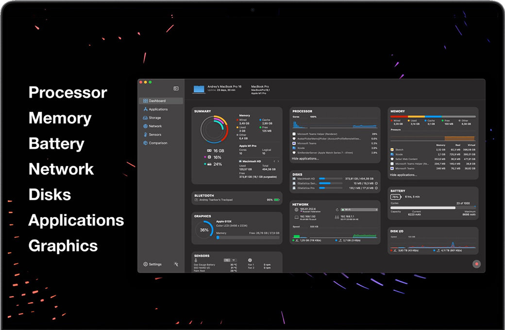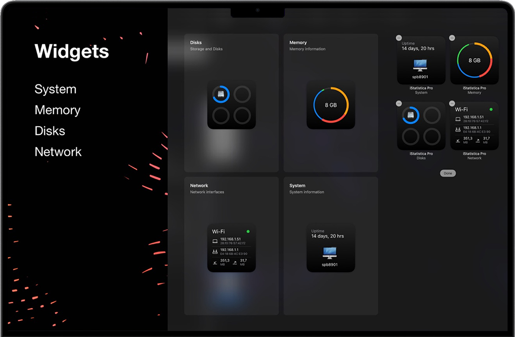 iStatistica Pro for Mac 是一款高级的系统监视器。它包括通知中心小部件和状态栏菜单。只需滑出通知中心即可随时关注您的CPU,内存,磁盘使用情况和网络活动。