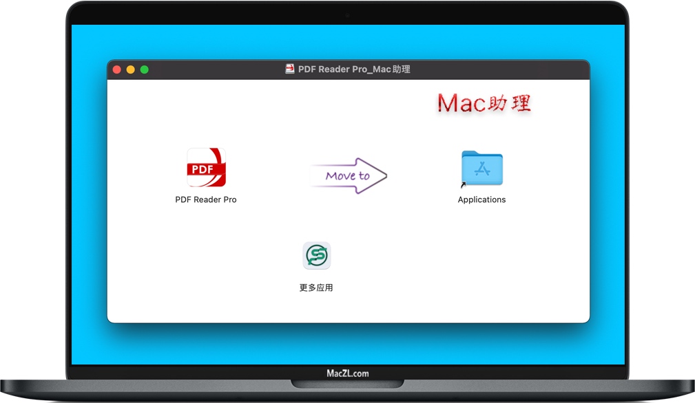 软件下载完成后,打开软件包如上图,拖动软件【PDF Reader Pro】到右边 Applications 文件夹里面进行安装软件。