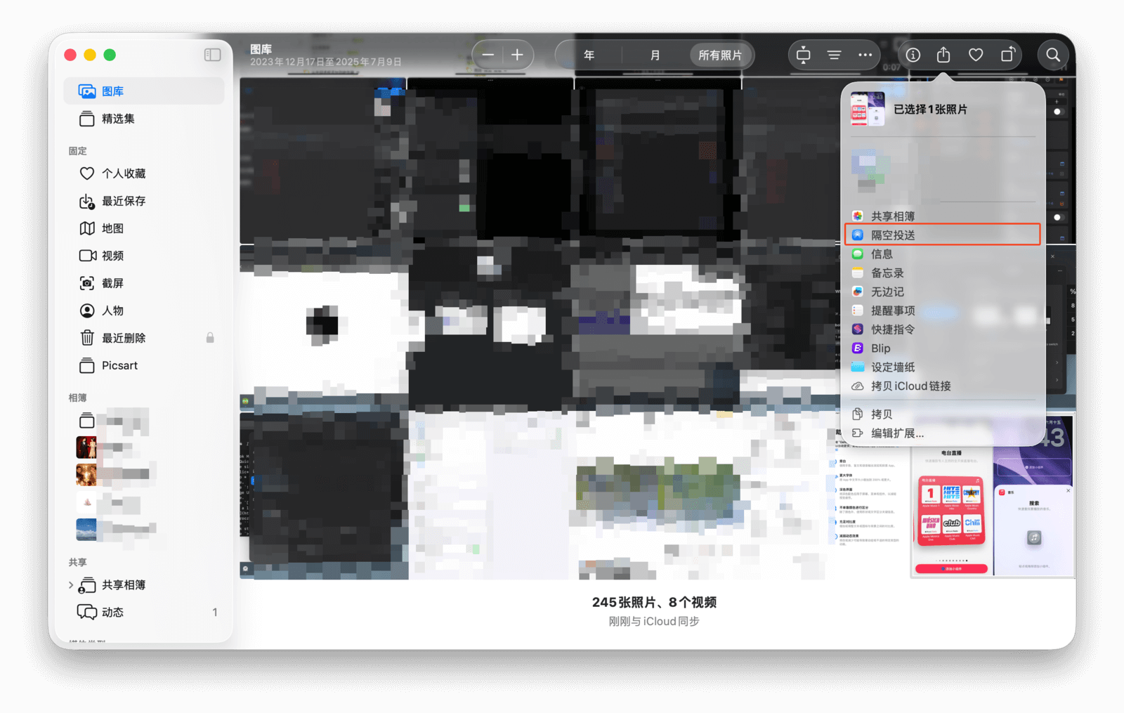 在分享菜单中选择「隔空投送」,此时会弹出一个窗口,在其中找到朋友的设备并点击,即可发送照片。