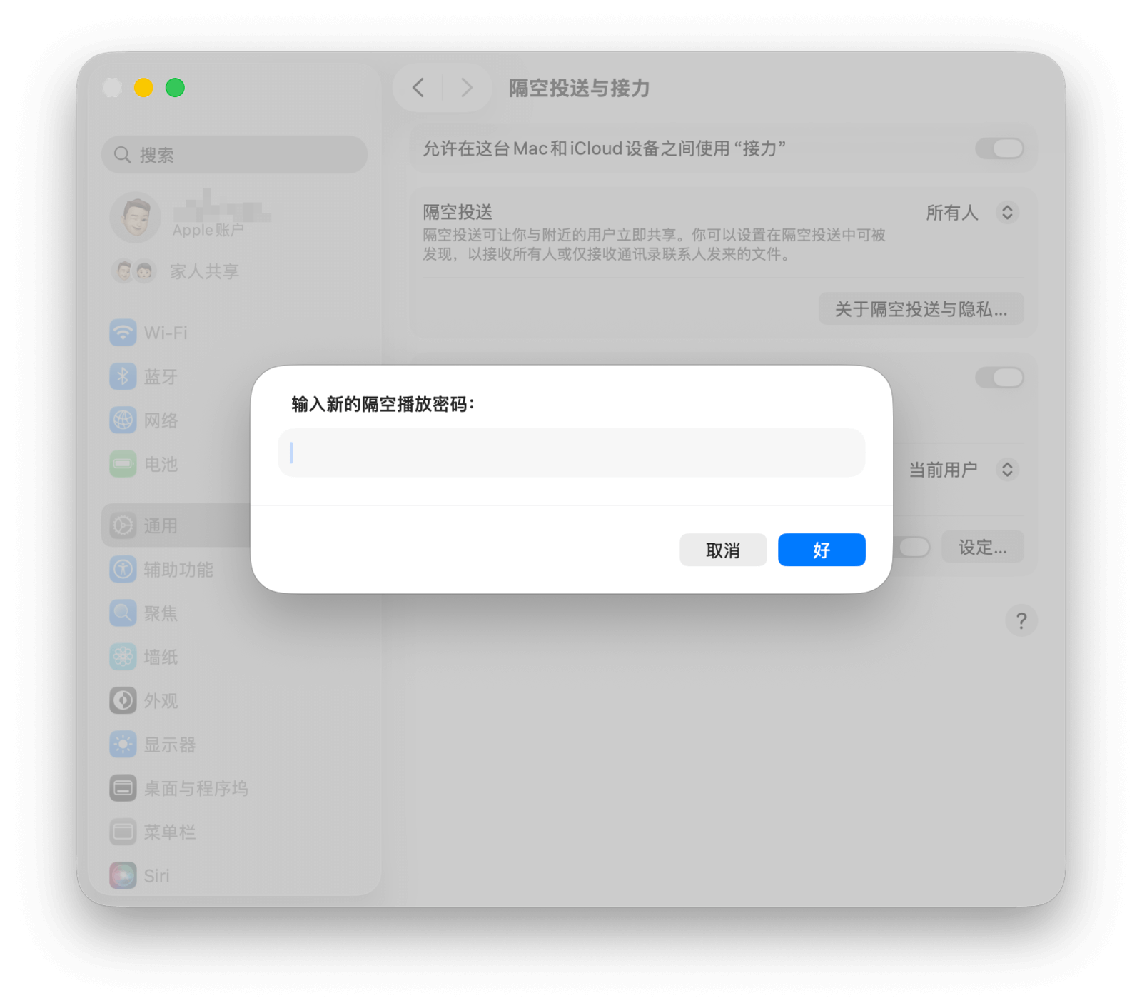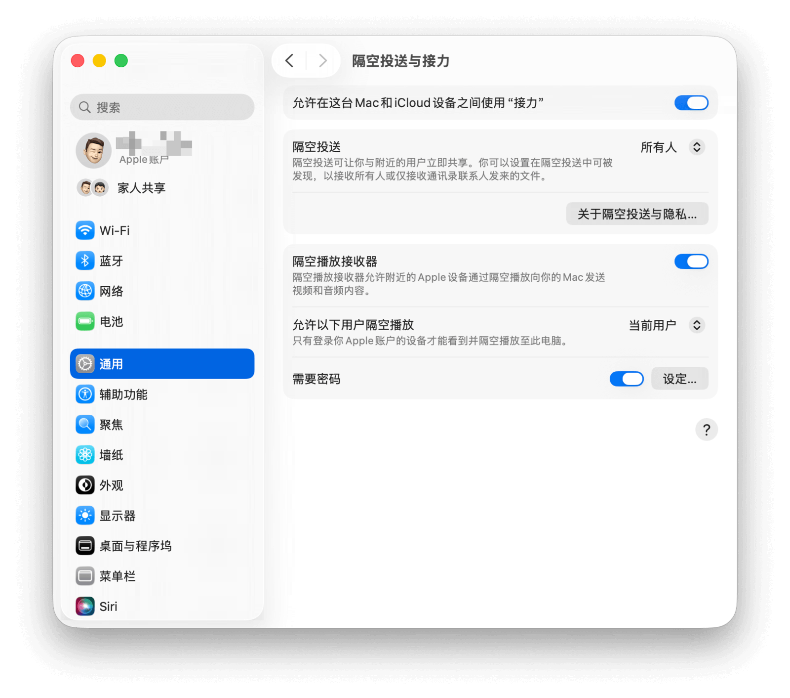 要避免这种情况,除了将权限设置为「当前用户」,你还可以启用密码保护。在「隔空投送与接力」设置中打开「需要密码」的开关并设定密码后,任何设备想要向你的 Mac 投送内容,都必须输入正确的密码。