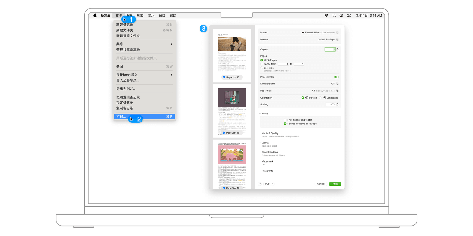 在需要打印的备忘录中,点击屏幕顶部的菜单栏,选择「文件」>「打印…」。