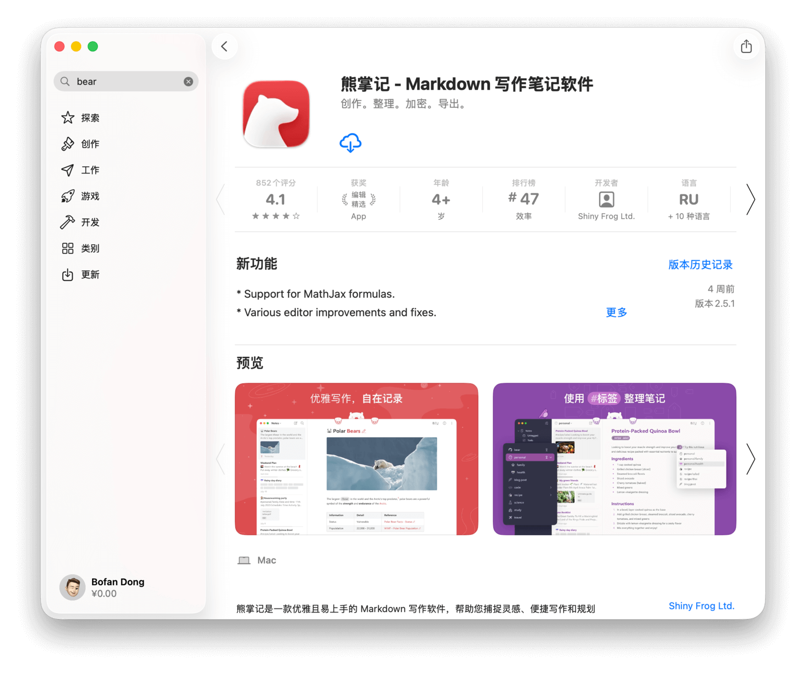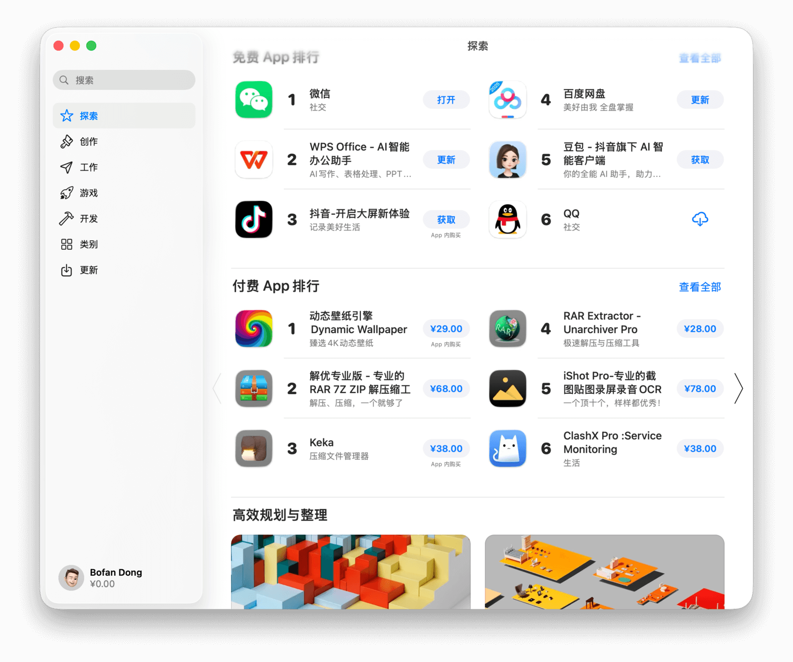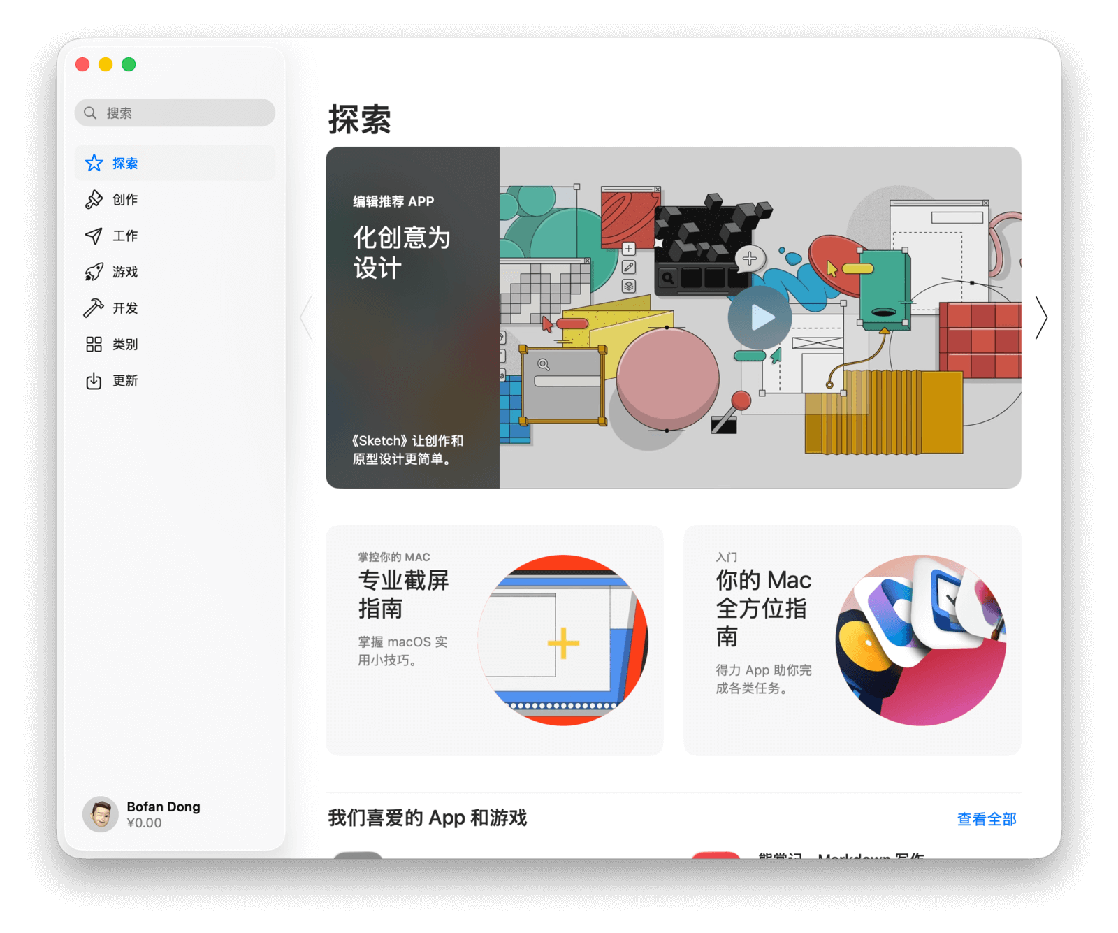 打开 App Store,首先映入眼帘的是「探索」界面。左侧导航栏包含探索、创作、工作、游戏等七个类别。下面,就来一起认识一下 Mac App Store。