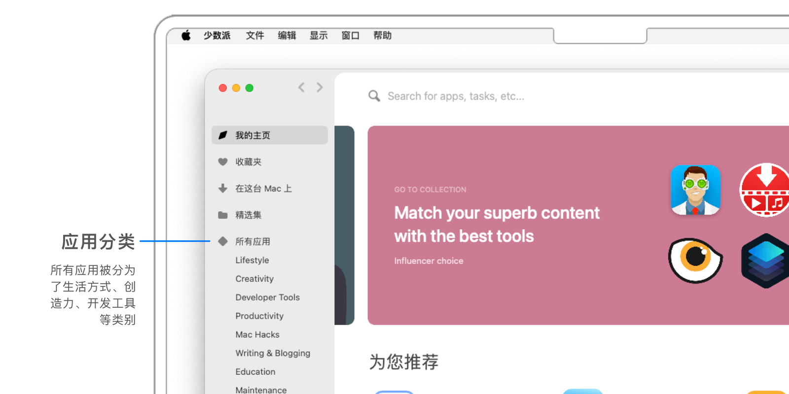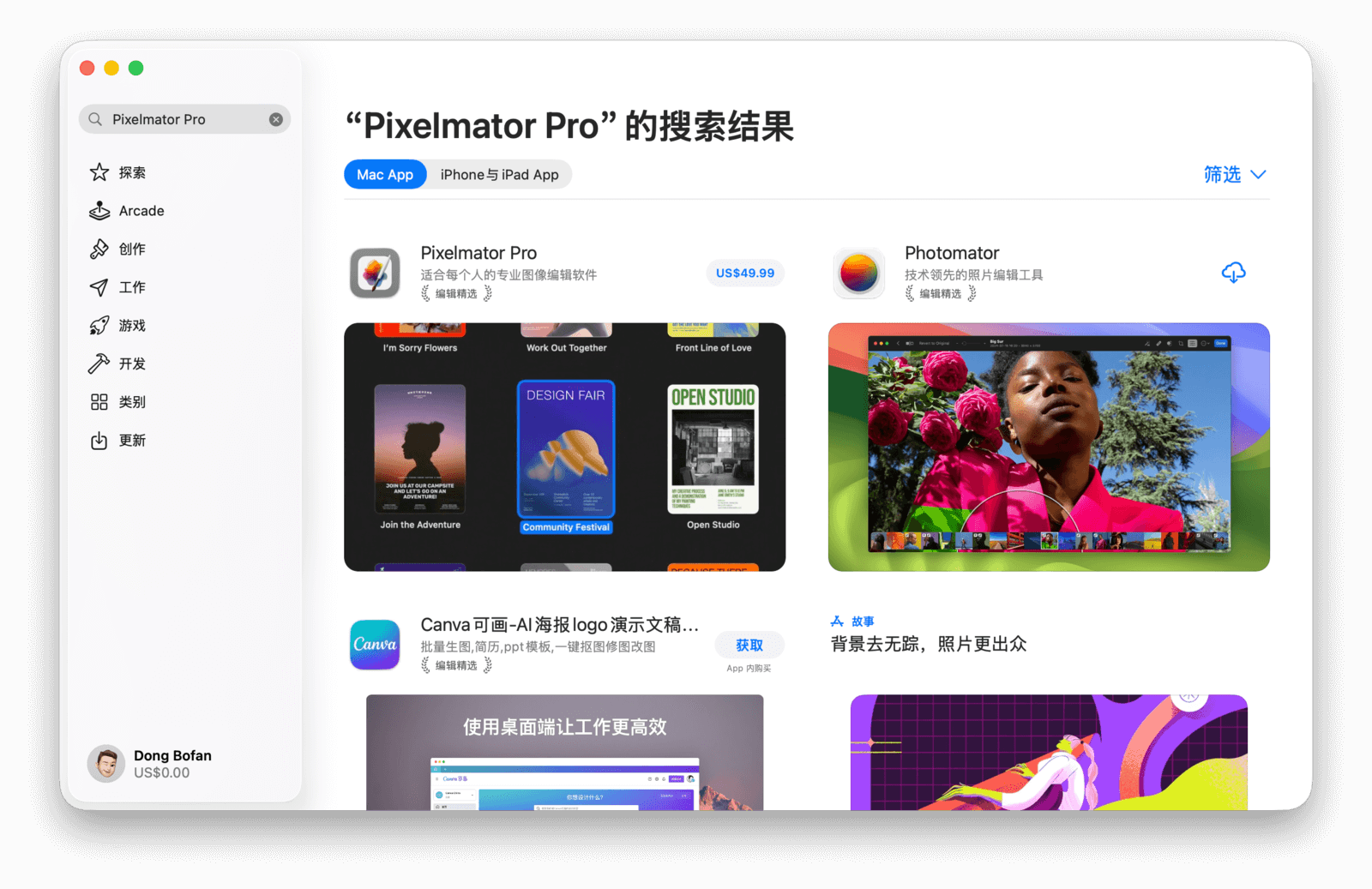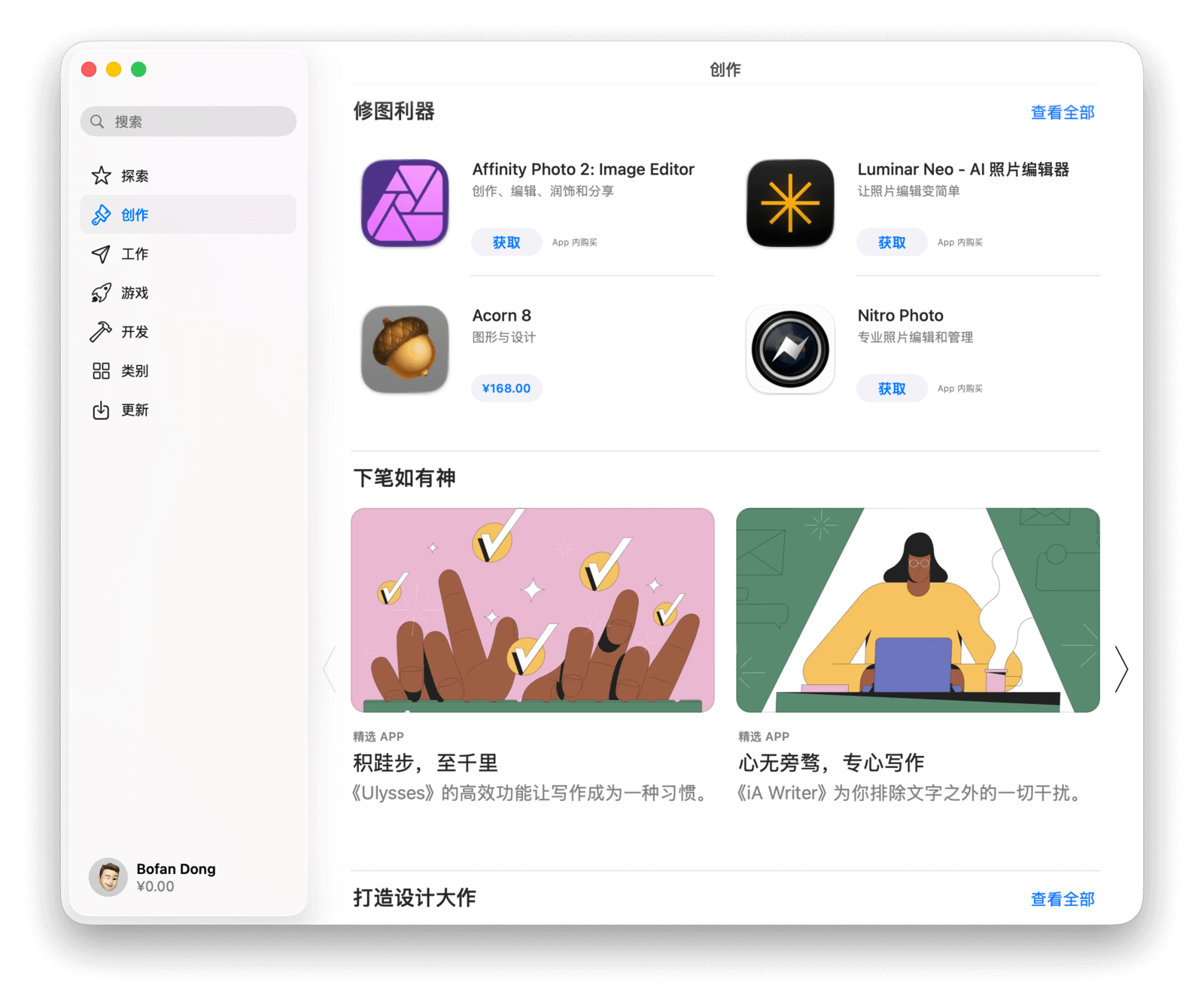 Apple 还从创作、工作、游戏、开发四个维度对应用进行了分类,方便用户更快地找到所需应用。以「创作」类别为例,顶部会推荐两款当下最热门或精选的应用。
