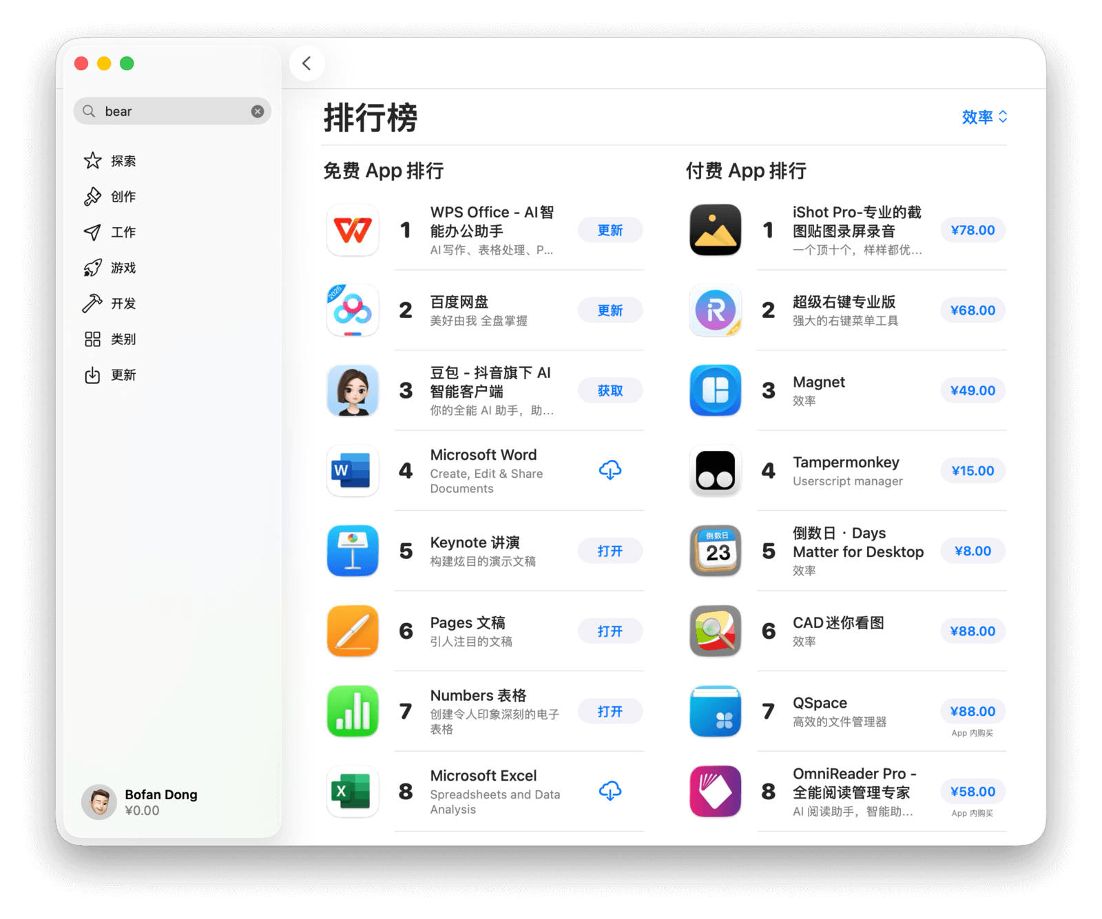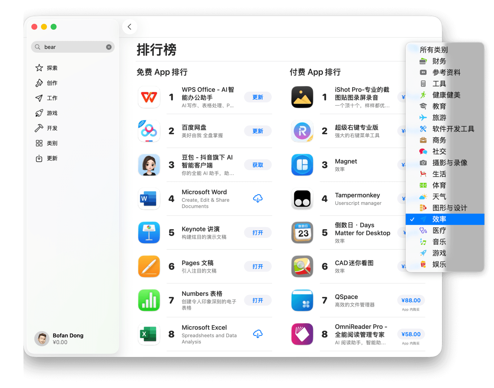 点击右上角的类别名称(如「效率」),可以切换排行榜类型,查看你感兴趣的类别下所有应用的排名。