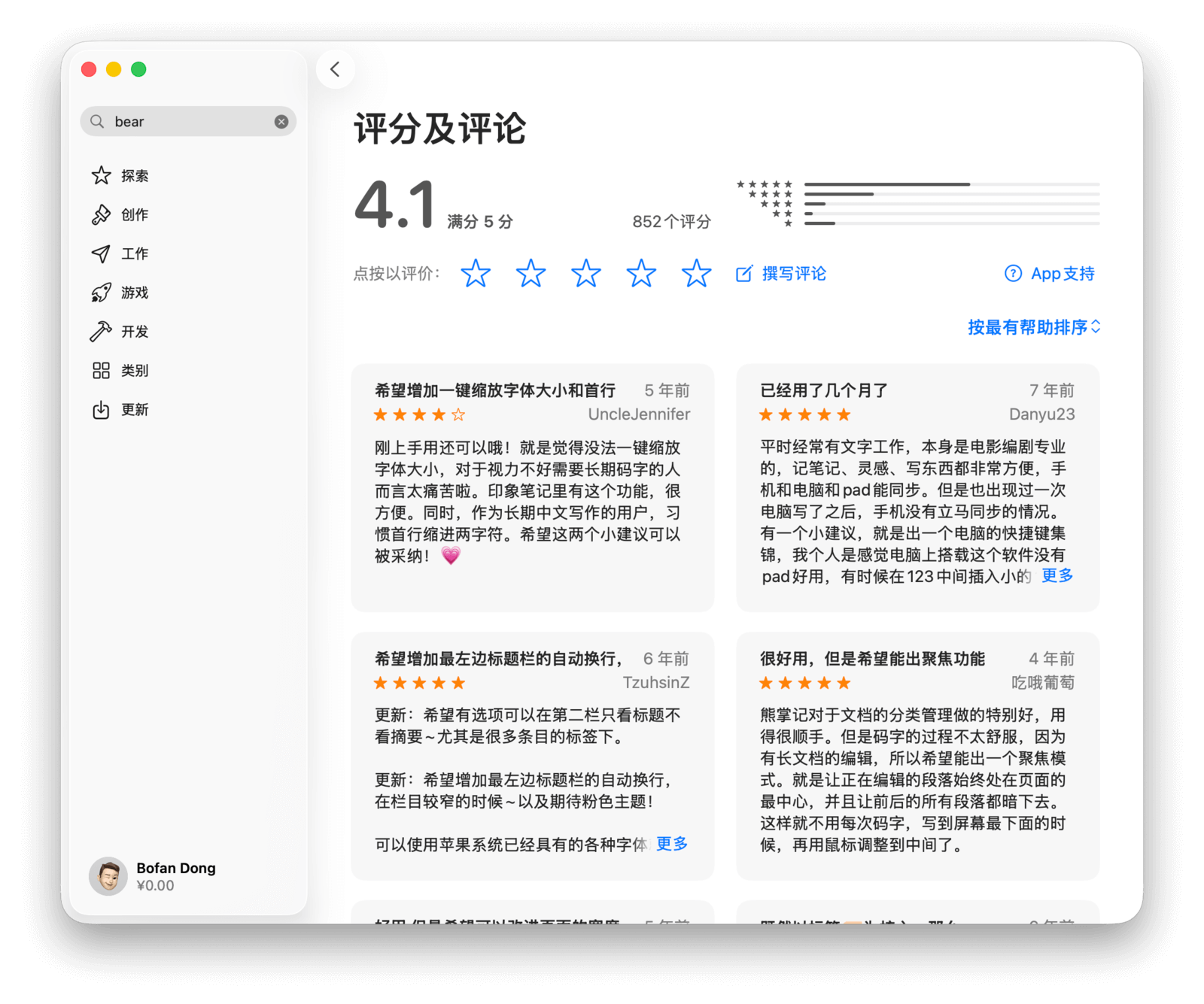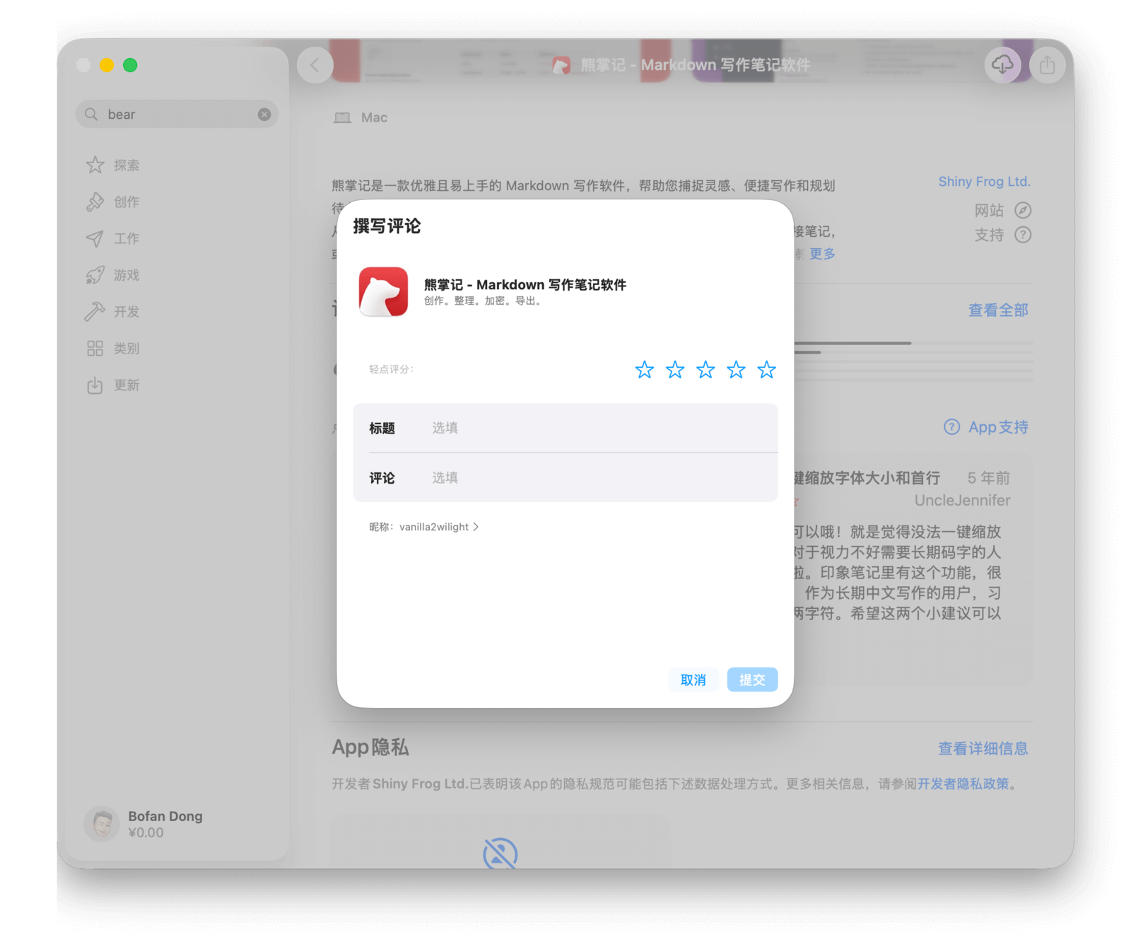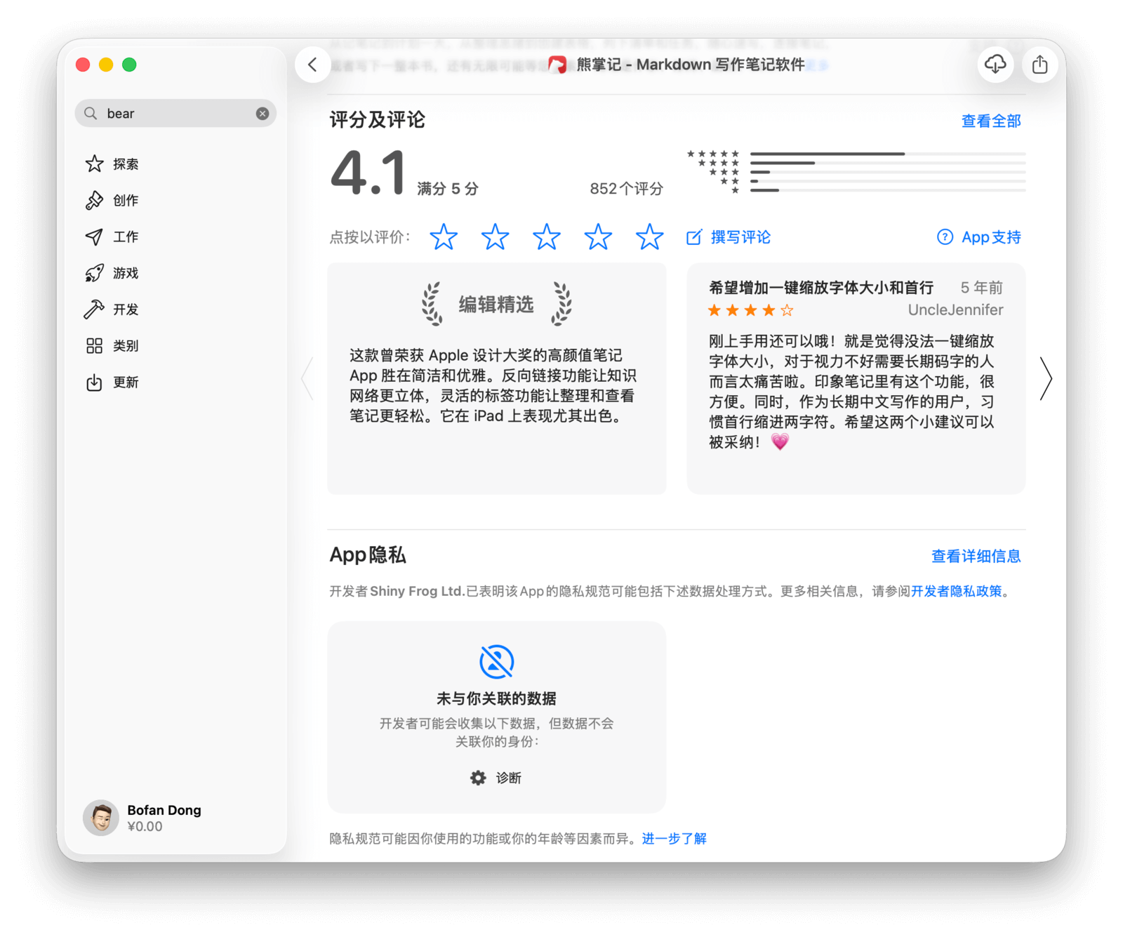 最后,你还可以根据自己的体验为应用撰写评论。如下图所示,点击「撰写评论」按钮,即可发表对应用的看法、评价、问题反馈或功能建议等。来自用户的真实反馈,会帮助开发者更好地优化应用。