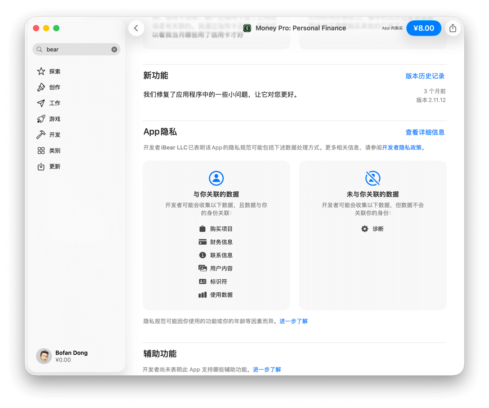 「App 隐私」包括三个部分:「用于追踪您的数据」「与您关联的数据」和「未与您关联的数据」。