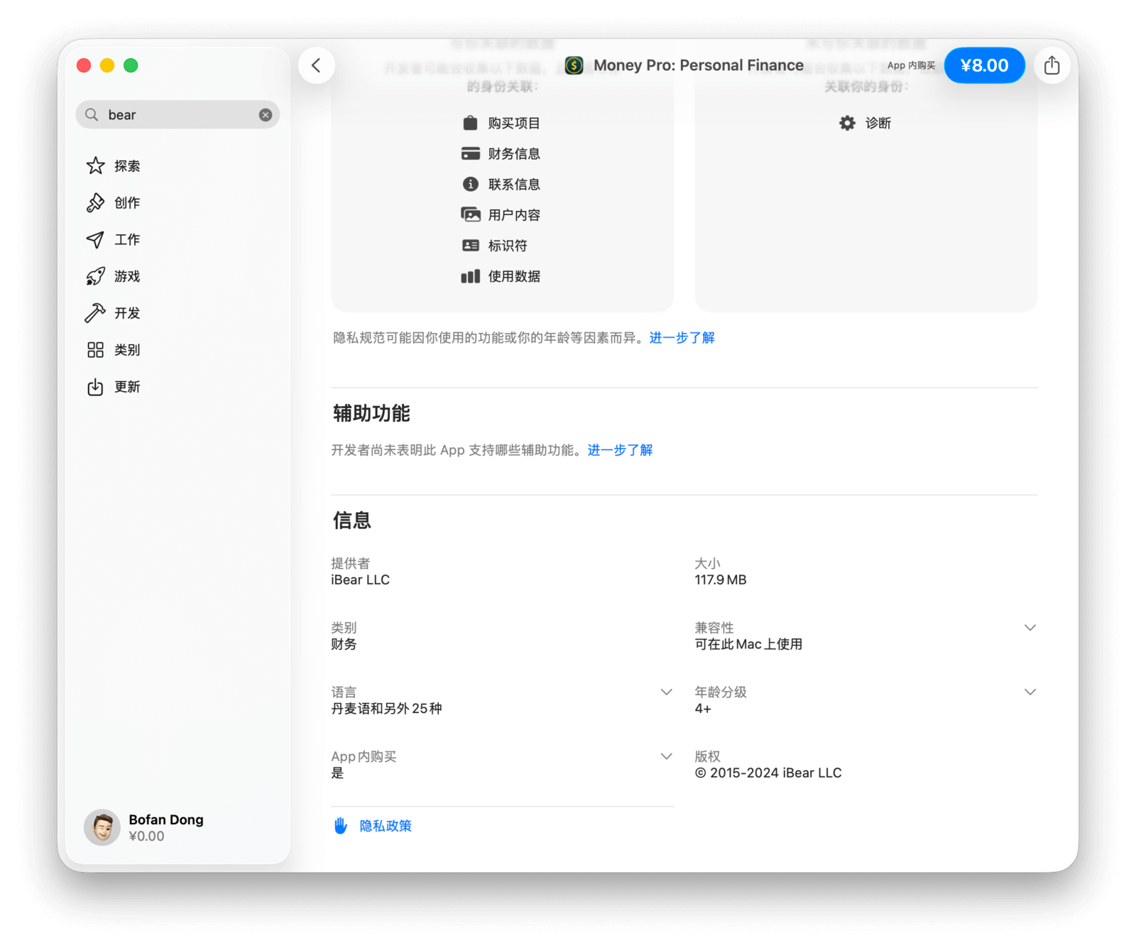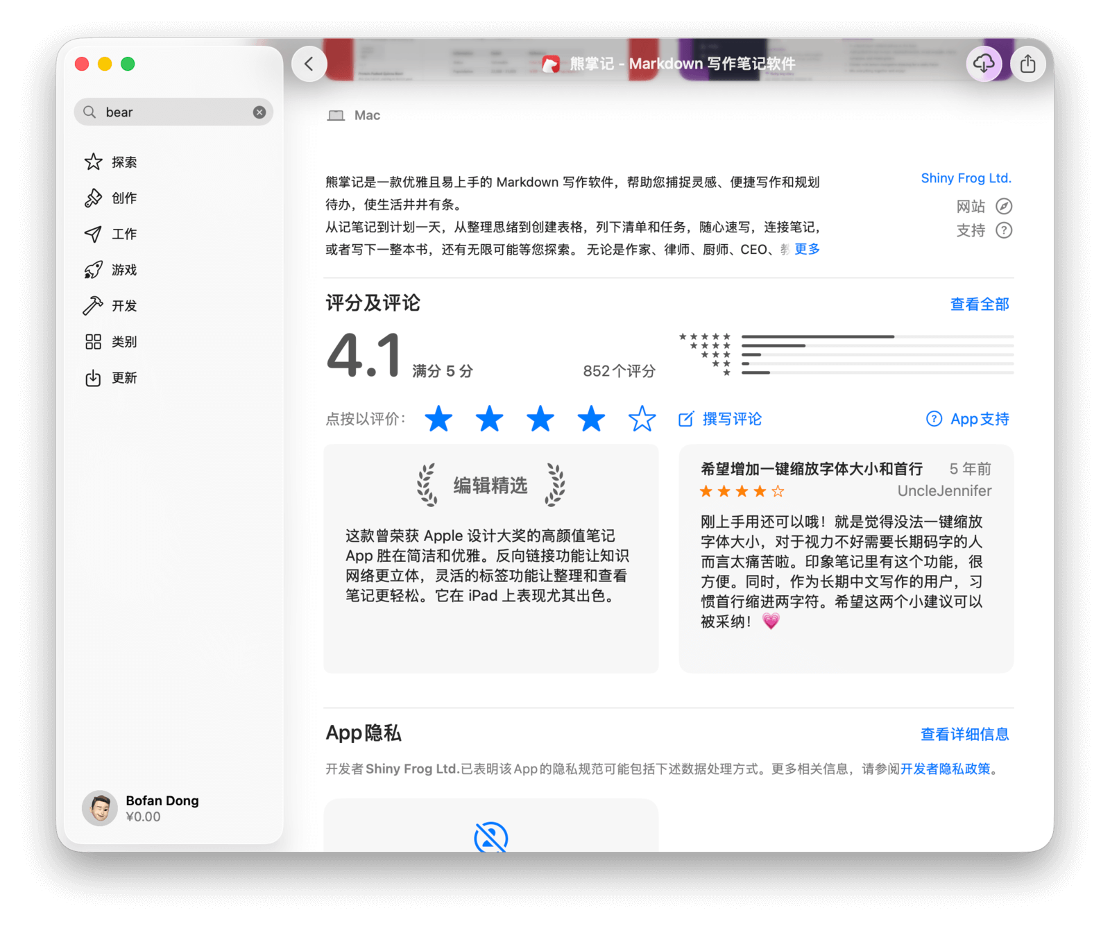 再往下是应用的详细信息,包括「App 隐私」和「信息」两部分。