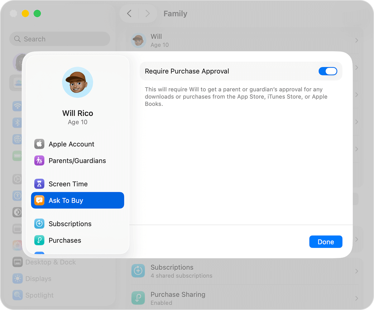 如果你和孩子正在使用家人共享的 Apple ID,可以在「系统设置」的「家人共享」中为孩子启用「购买前询问」(Ask to Buy)功能。启用后,你可以临时允许孩子下载超出年龄限制的应用,但也能随时撤销权限,阻止孩子继续访问。
