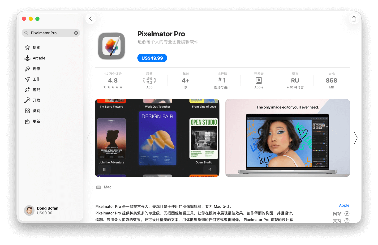 在 App Store 内,部分应用需要付费购买。假设账户已绑定好支付方式,接下来就可以购买应用了。此处以「Pixelmator Pro」为例,在搜索框中输入关键词「Pixelmator Pro」,可以看到 App Store 还会联想出相关应用,选择目标应用进行搜索。