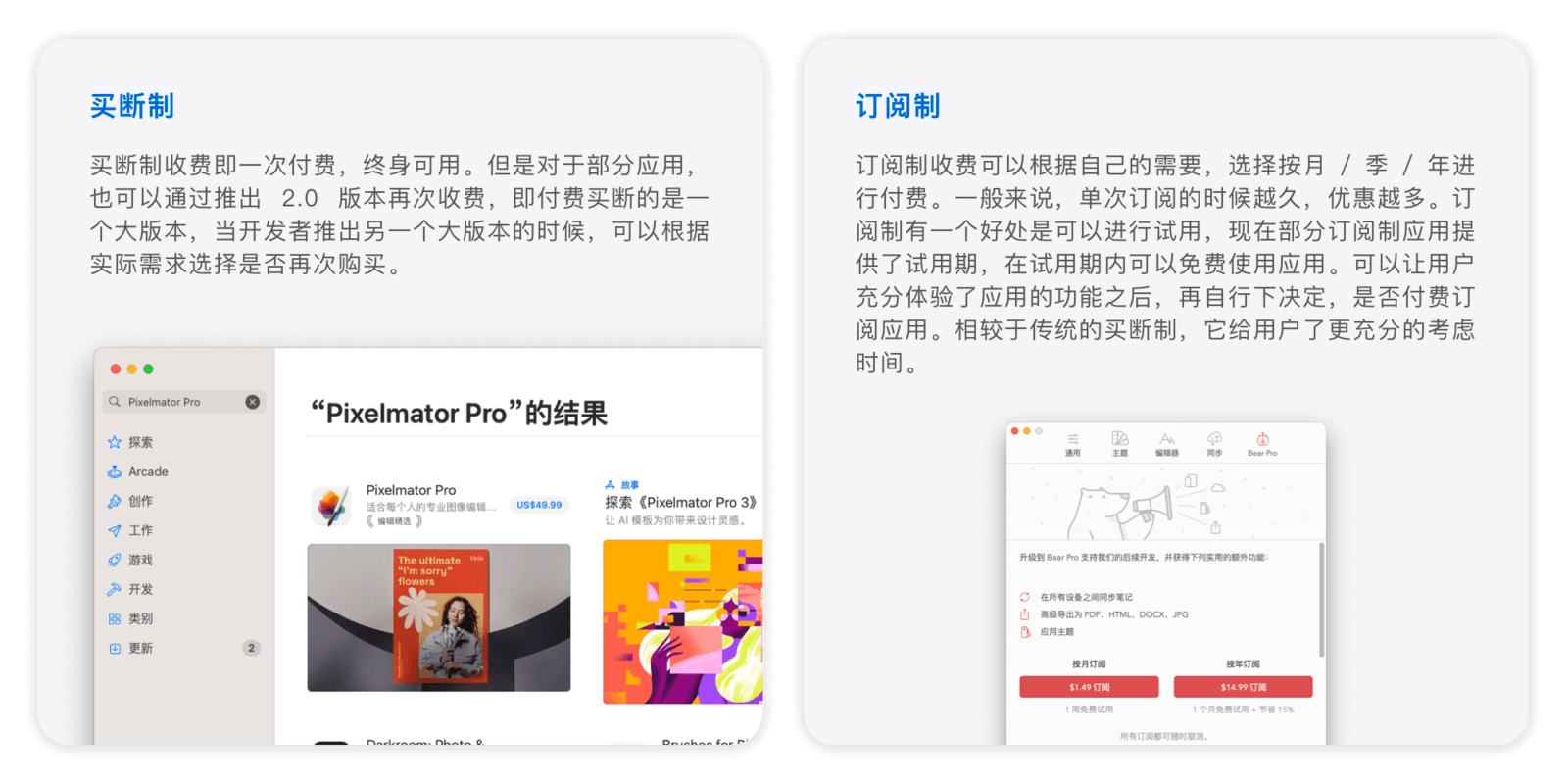 像「Pixelmator Pro」这类应用属于买断制,即一次付费,终生使用。但在 App Store 中,还有另一种付费方式:应用内付费。应用内付费又可分为买断制和订阅制。