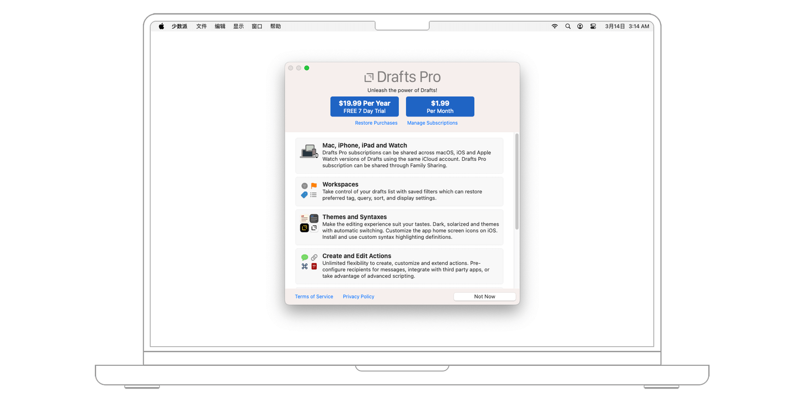 以效率应用 Drafts for macOS 为例,安装后初次运行会询问是否升级到 Drafts Pro(专业版)。从图中可以看出,Drafts Pro 提供年付和月付两种订阅方式,其中年付包含 7 天免费试用期。