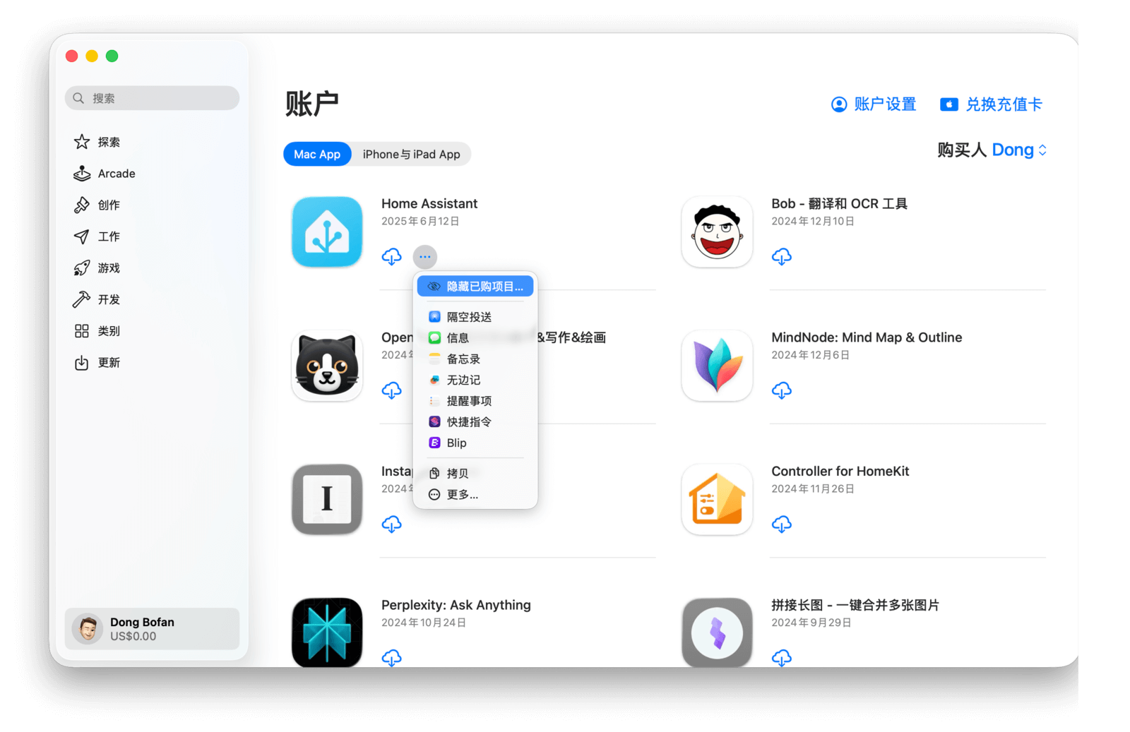 如果试用某个应用后觉得不合适,又不想让它出现在已购项目列表中,可以将其隐藏。打开「已购项目」页面,将鼠标移动到需要隐藏的应用上,旁边会出现「更多」按钮图标,点击并选择「隐藏已购项目」即可。