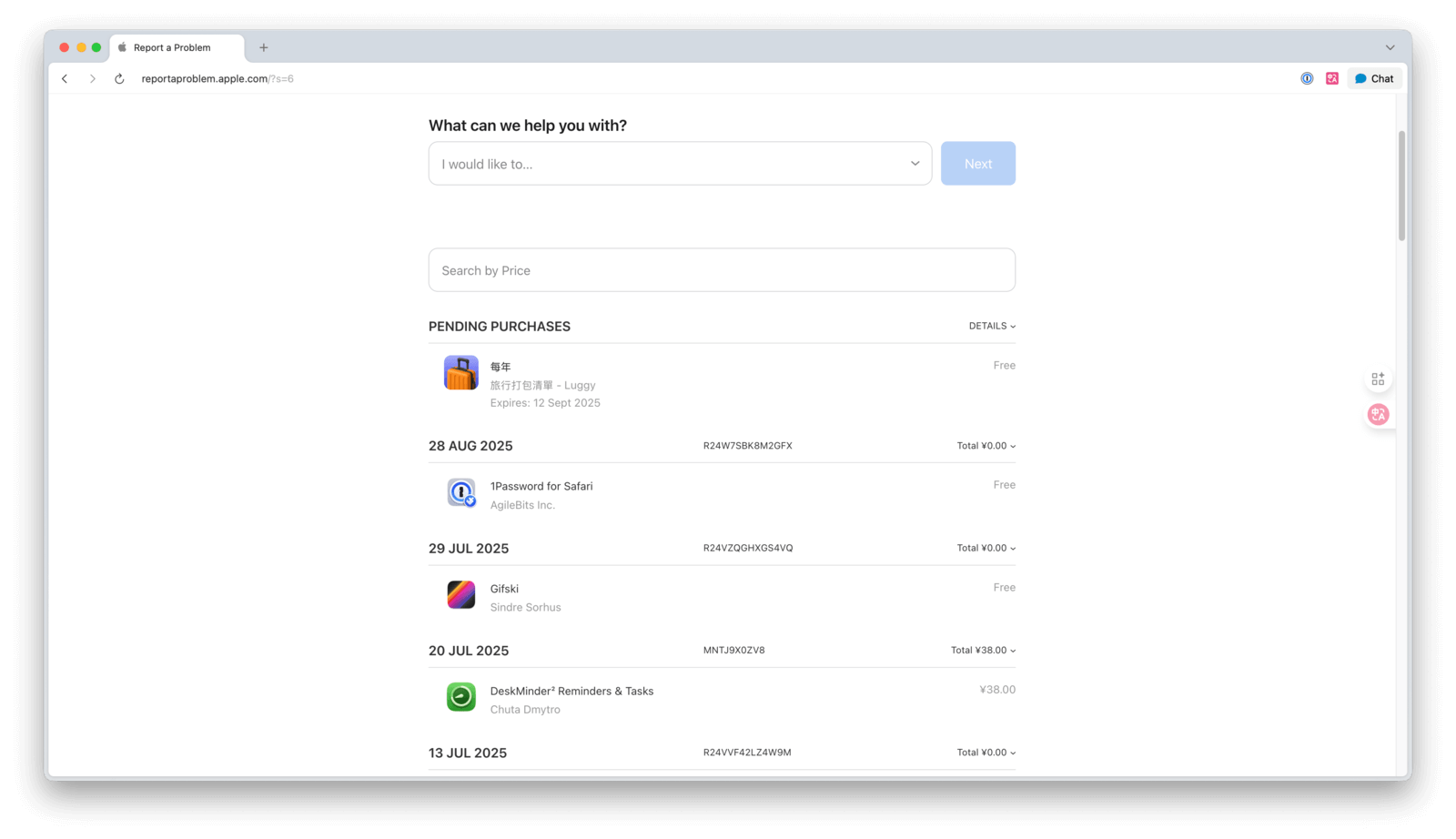 如果因为意外购买或试用后不满意等原因需要退款,可以向上 Apple 申请。以上文购买的「Pixelmator Pro」为例,购买成功后,Apple 会向你的邮箱发送一张收据。点击收据邮件里的「报告问题」按钮,即可跳转到 Apple 的申请退款页面。