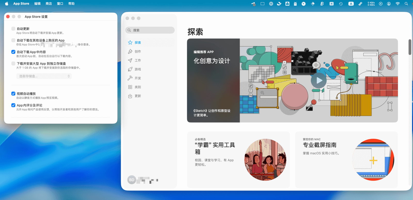 App Store 提供了一些偏好设置,你可以根据个人习惯进行调整。打开 App Store,在菜单栏选择「App Store > 设置…」,在这里可以开启或关闭「自动更新」,开启后可让应用始终保持最新版本。