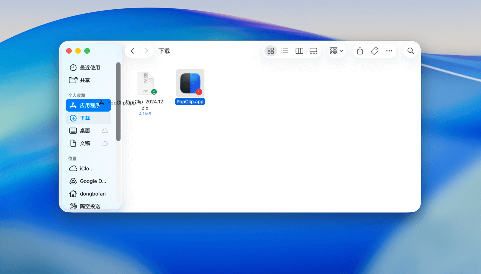 此时,前往「下载」文件夹,或直接点击 Safari 下载列表中该应用右侧的放大镜图标,就会跳转到其所在位置。这个程序可以直接点击运行,但为了方便日后查找和管理,建议将它拖入「应用程序」文件夹中。