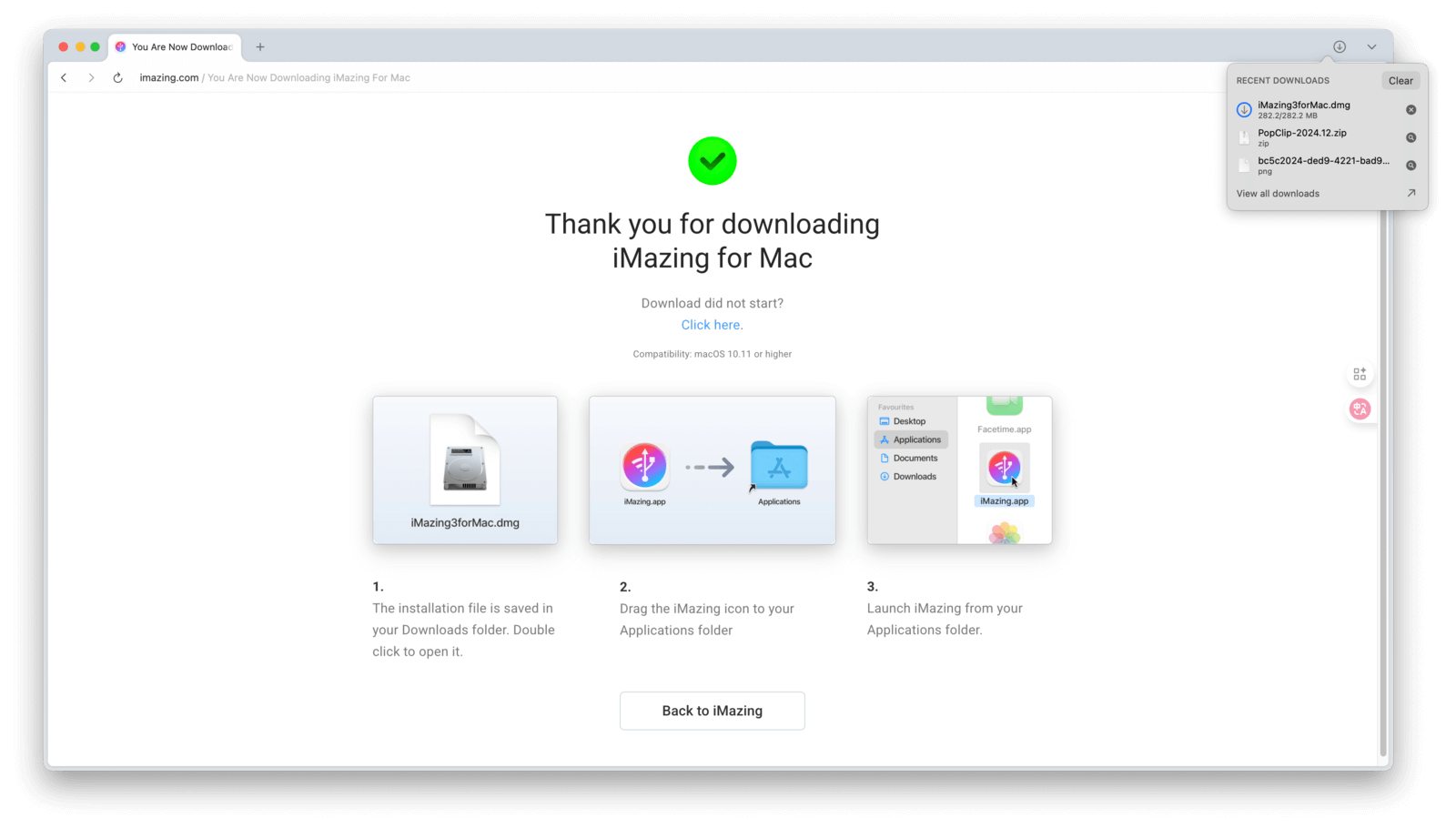接下来看看 dmg 格式。相较于 zip,dmg 格式在安装体验上更为便捷。以 iMazing 为例,前往其官网点击「Download for Mac」下载。在下载列表中可以看到,文件名以 .dmg 结尾。