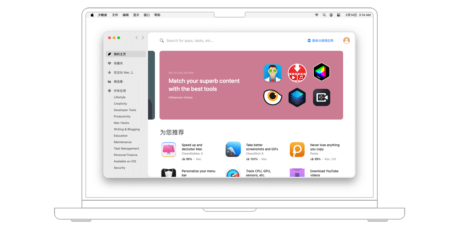 向下滑动,可以看到更细分的软件合集,例如「修图利器、下笔如有神、打造设计大作」等,它们分别对应图片编辑、文字写作、图形设计等类型的应用。如果你刚开始接触某一类应用,不知道如何选择,不妨参考此处的推荐。
