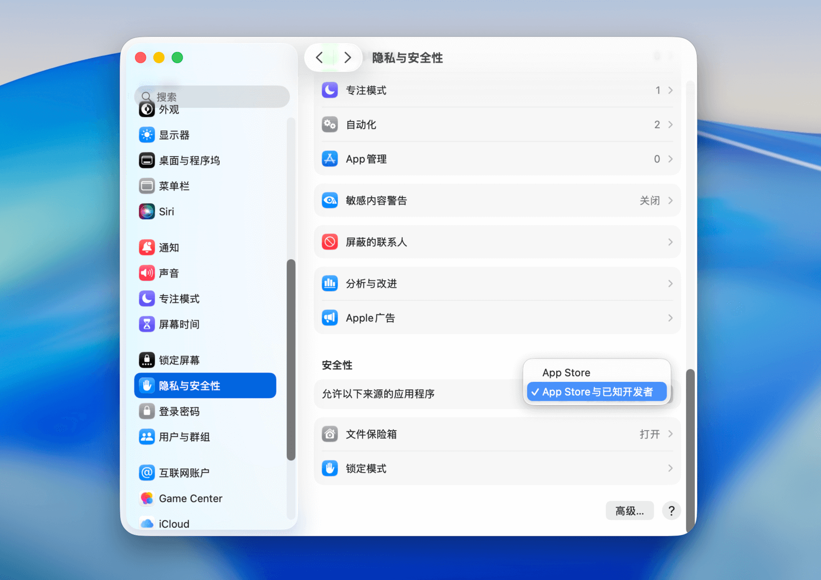 首先,你需要在「系统设置 - 隐私与安全性」中,将「允许以下来源的应用程序」选项设置为「App Store 和被认可的开发者」。