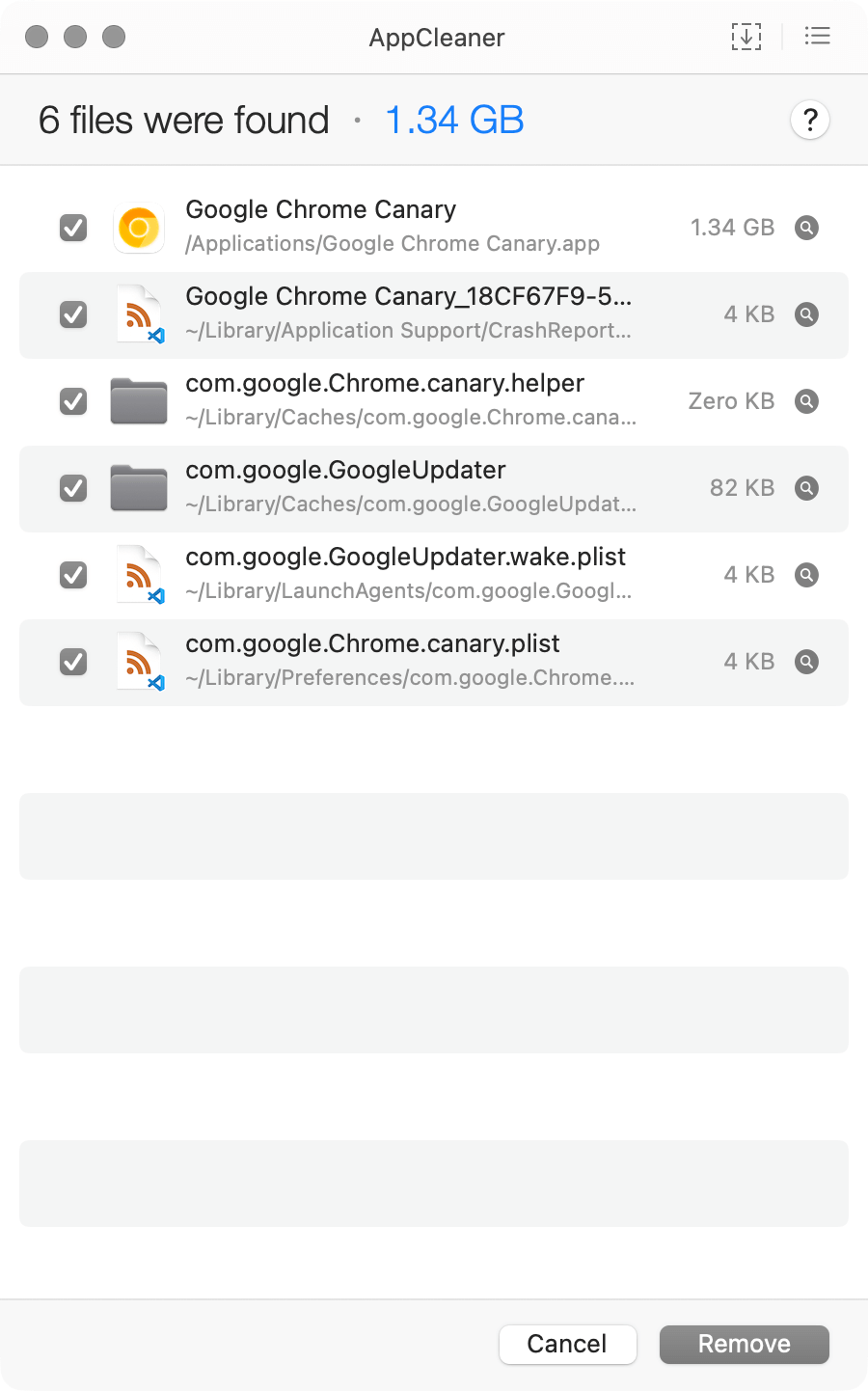 只需将需要彻底卸载的应用从「应用程序」文件夹拖入 AppCleaner 窗口,稍等片刻,它就会列出所有相关的缓存、配置文件等,点击右下角的「Remove」即可一键删除所有相关文件。