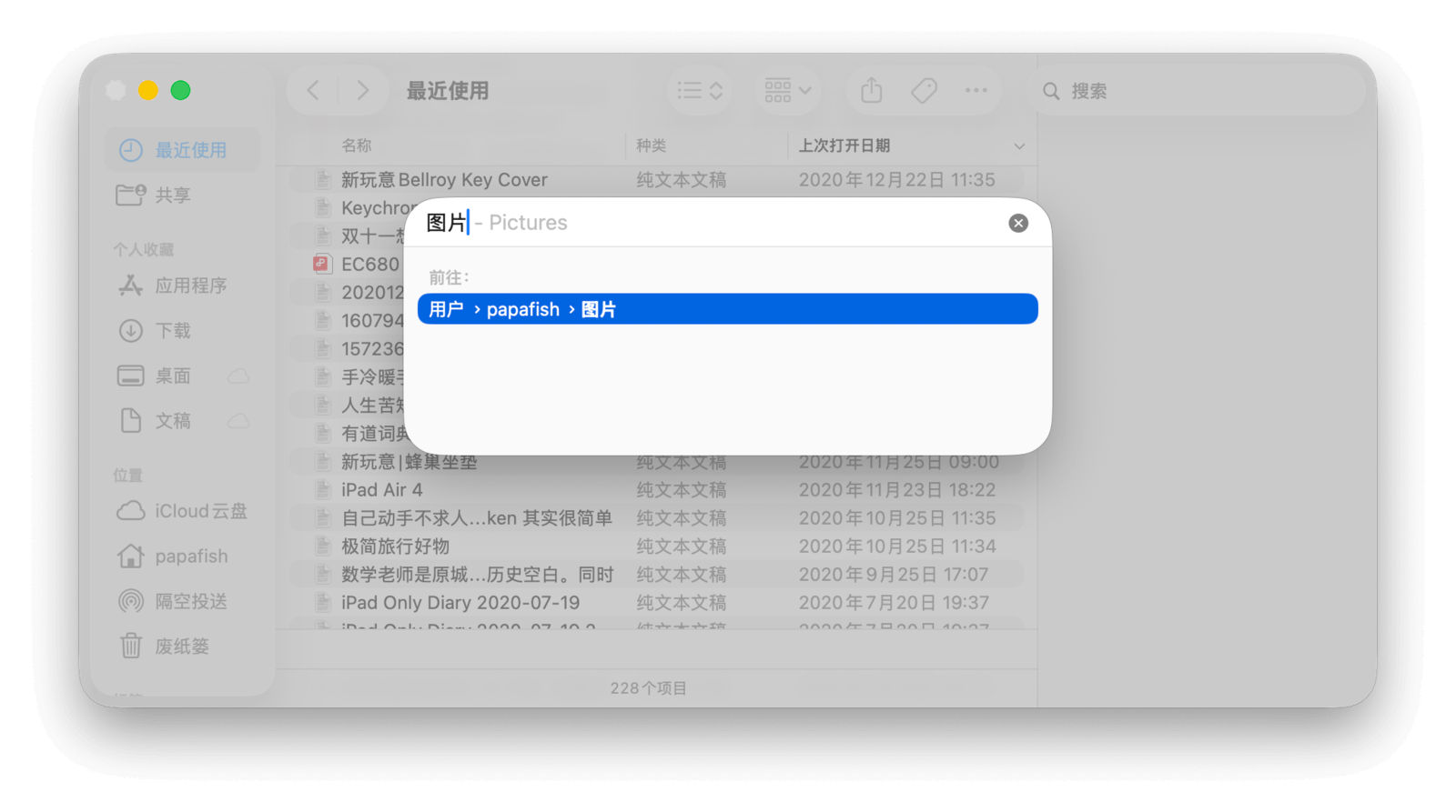 当你需要打开指定路径的文件夹时,逐层点击既费时又费力。你可以选择「访达」→「前往」→「前往文件夹…」,然后输入文件路径直接跳转。