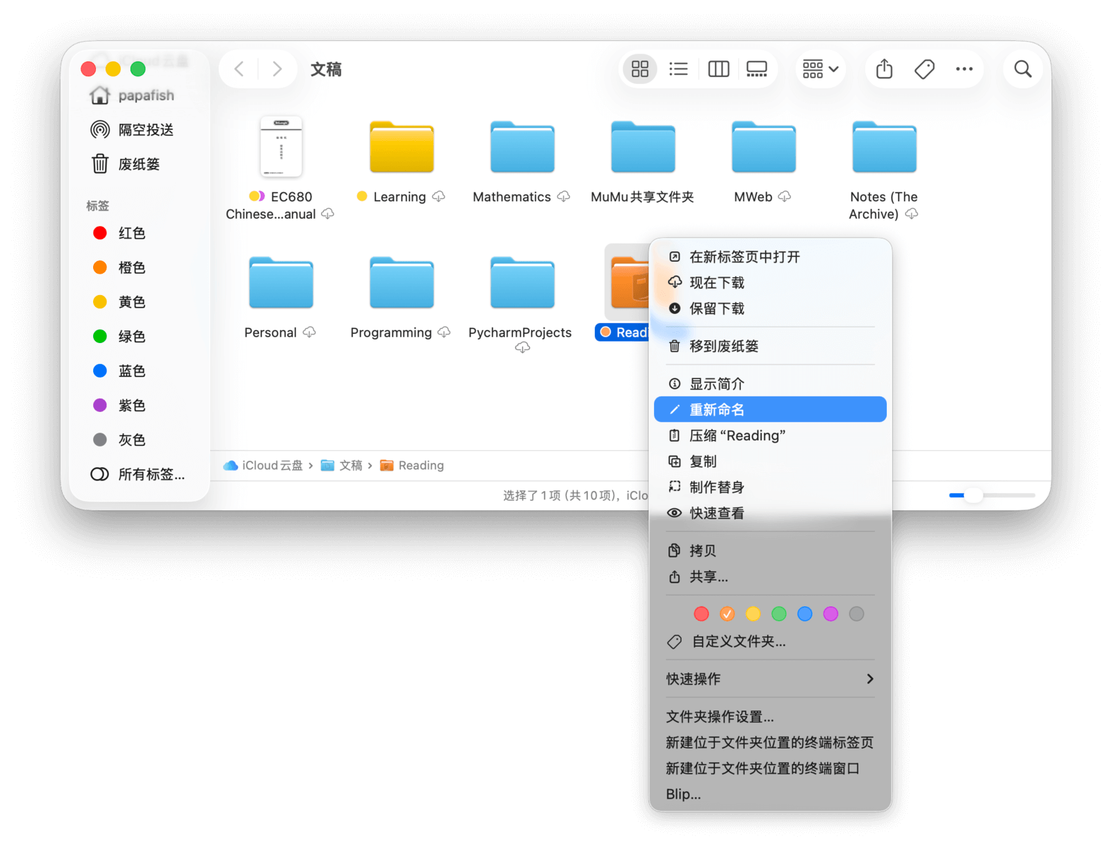 选中一个文件或文件夹,右键(或双指轻点触控板)呼出菜单,可以选择删除、压缩、更改打开方式等操作。