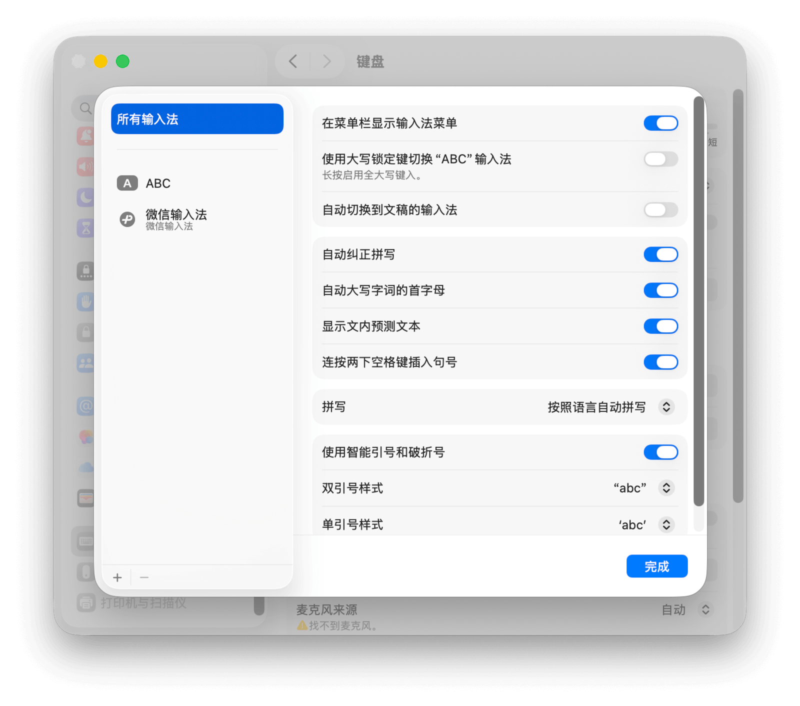 在「文本」面板中,你可以配置与文本输入相关的功能。其中大部分功能仅适用于 macOS 自带输入法;若你使用第三方输入法,这些设置可能不会生效。