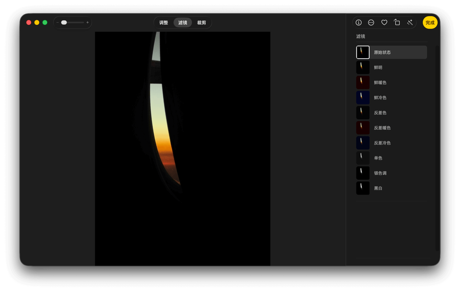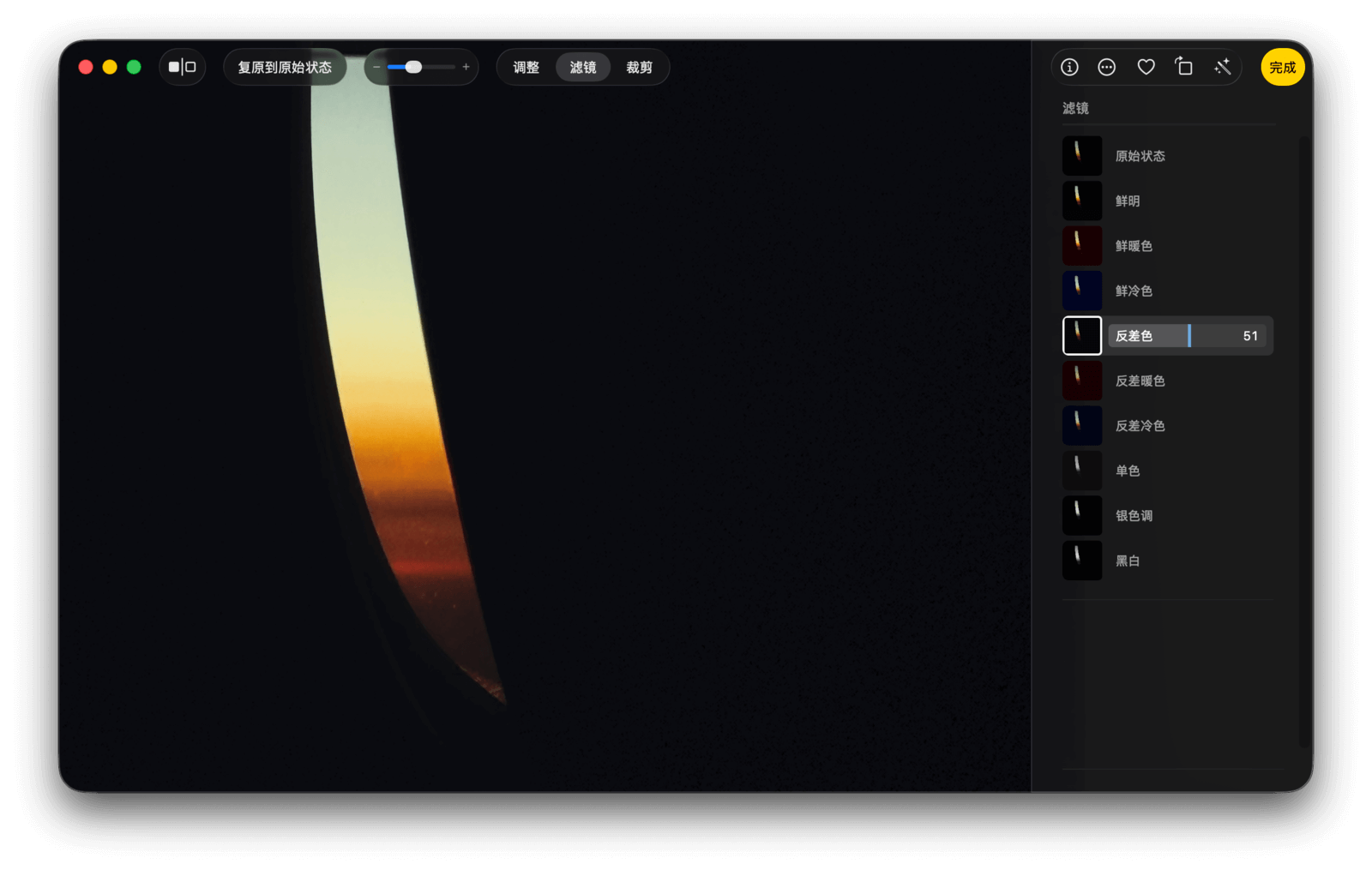 在滤镜面板中,除了原始状态,还提供了鲜明、鲜暖色、鲜冷色、反差色、反差暖色、反差冷色、单色、银色调、黑白等 9 种滤镜,每一种滤镜在应用后都可以调整强度。