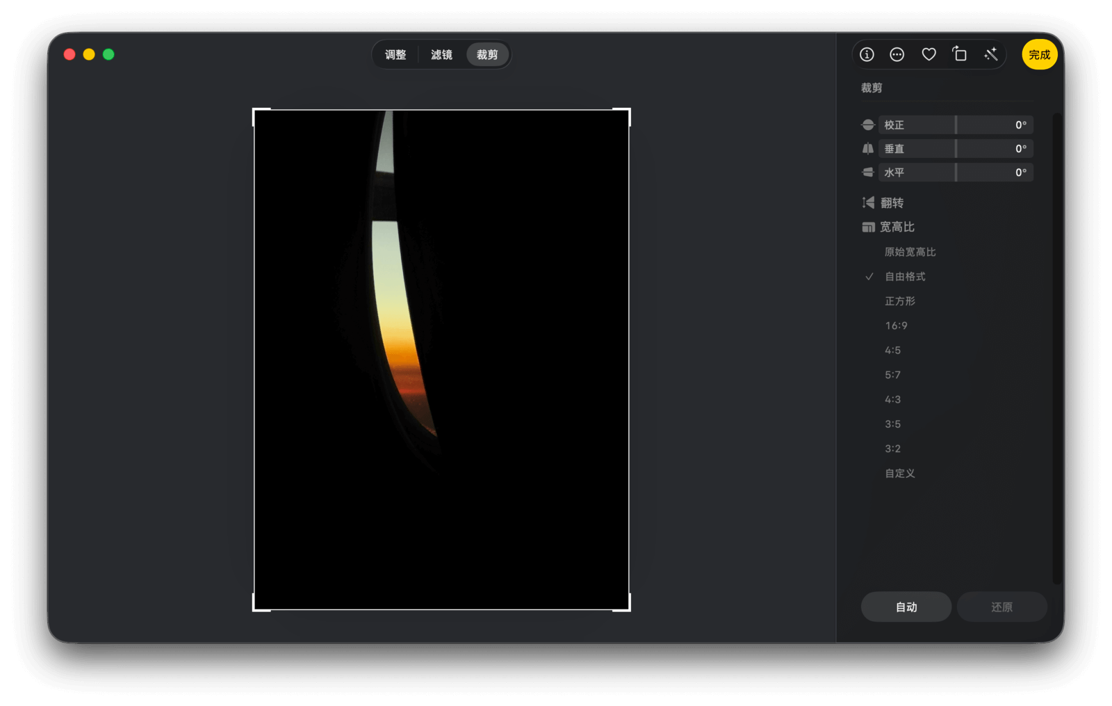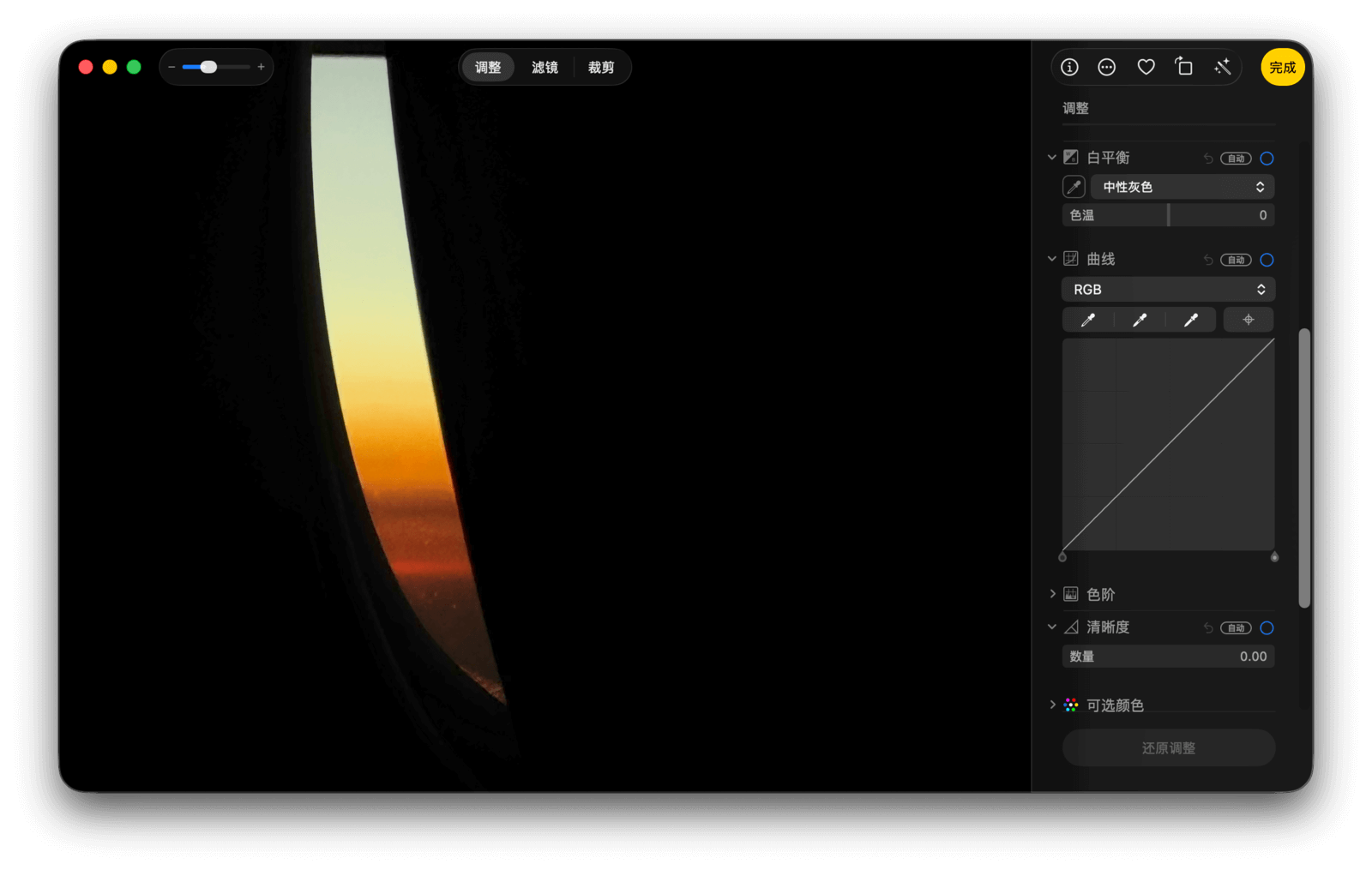 如果你对自动调整的效果不满意,当然可以亲自上手。再次点击魔术棒按钮即可移除「自动增强」效果,然后点击其右侧的「编辑」按钮,便可进入手动编辑模式。编辑功能主要分为三种模式:调整、滤镜和裁剪。
