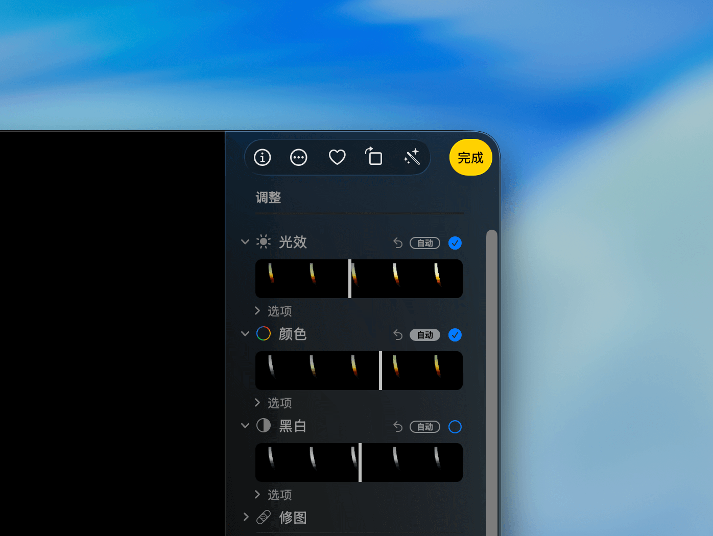 每种调整选项都可以通过勾选来单独启用或关闭,也可以点击「自动」让照片应用为你挑选合适的参数值。点击「返回」按钮,则可以撤销最近一次调整。