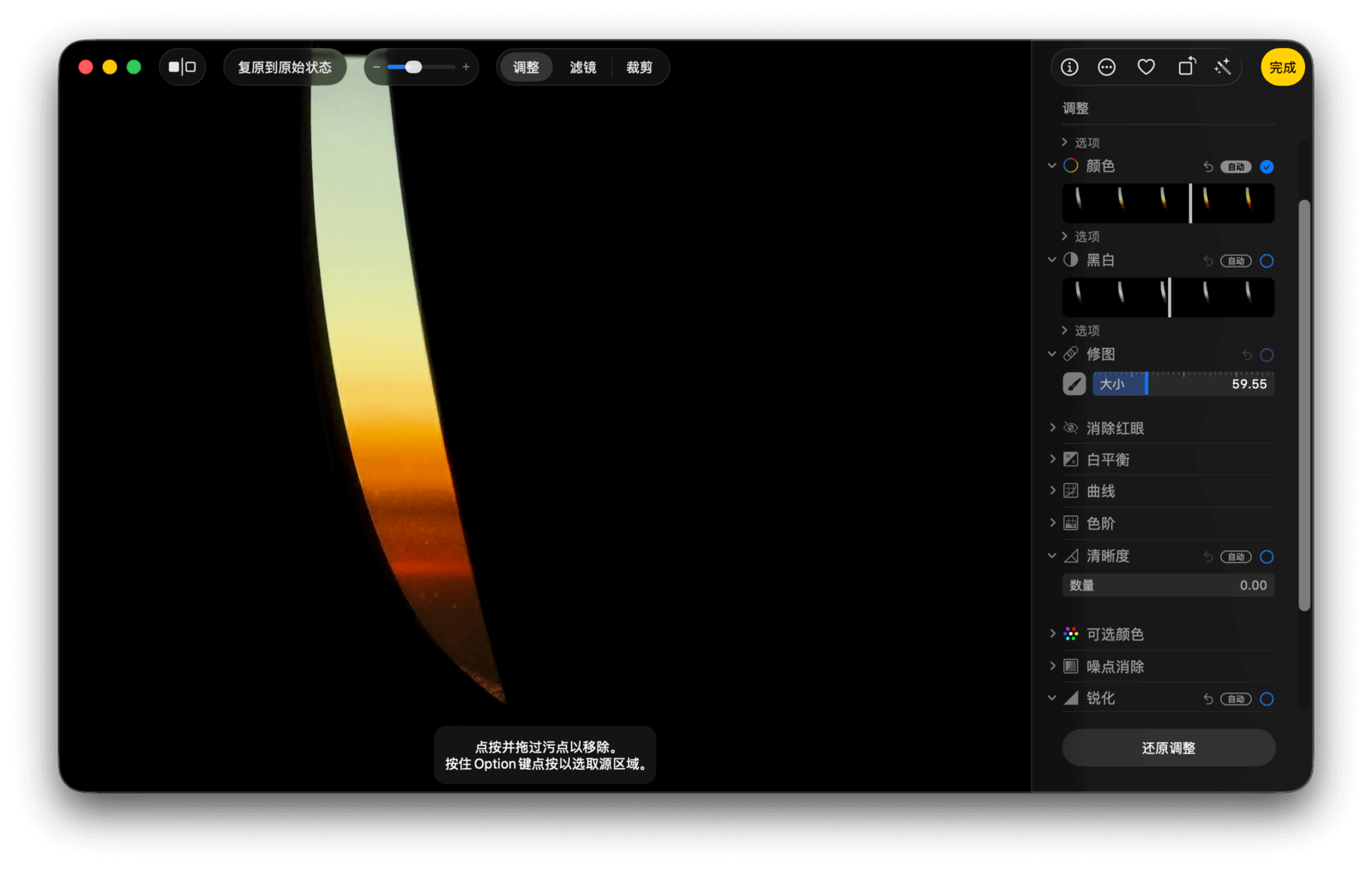 首先是润饰功能。按住 Option 键并点按以选取源区域,松开 Option 键后,再点按并拖动鼠标即可移除污点。