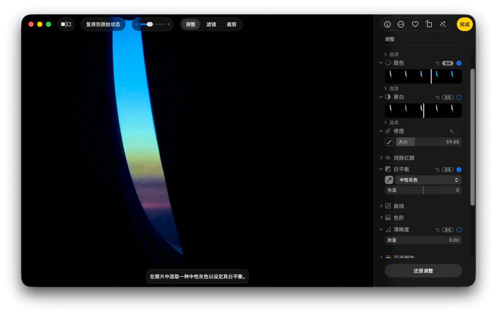 其次是白平衡功能。白平衡提供了中性灰色、肤色和色温/色调三种模式,你可以分别调整其参数值。此外,你还可以使用测色计工具,通过吸取照片中的任意颜色来设定整张照片的白平衡。
