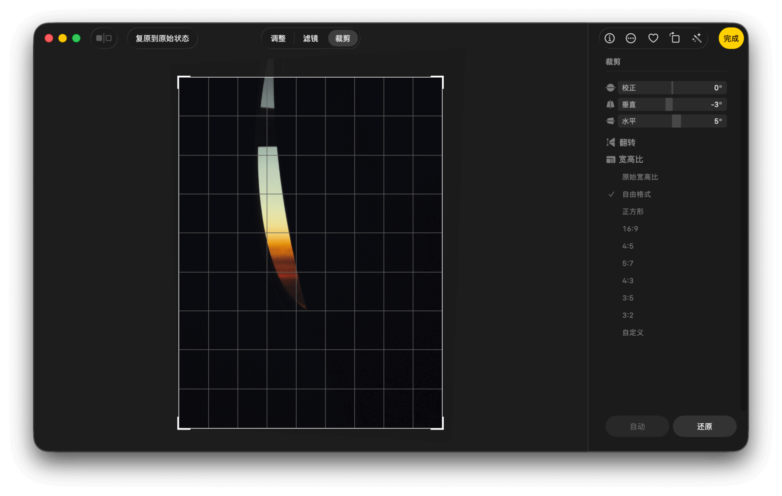 在裁剪面板中,你可以对照片进行校正、垂直和水平三个方面的角度调整,还可以水平翻转以及按各种预设比例进行裁剪。
