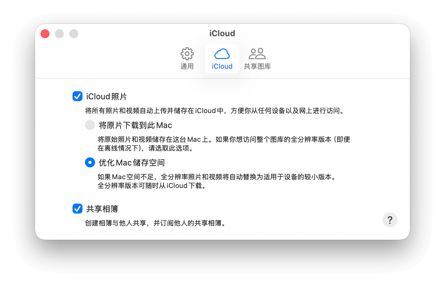 要启用此功能,请打开照片应用,使用快捷键 `Command + ,` 或通过菜单栏进入「照片」>「设置...」,在「iCloud」标签页下勾选「共享相簿」。