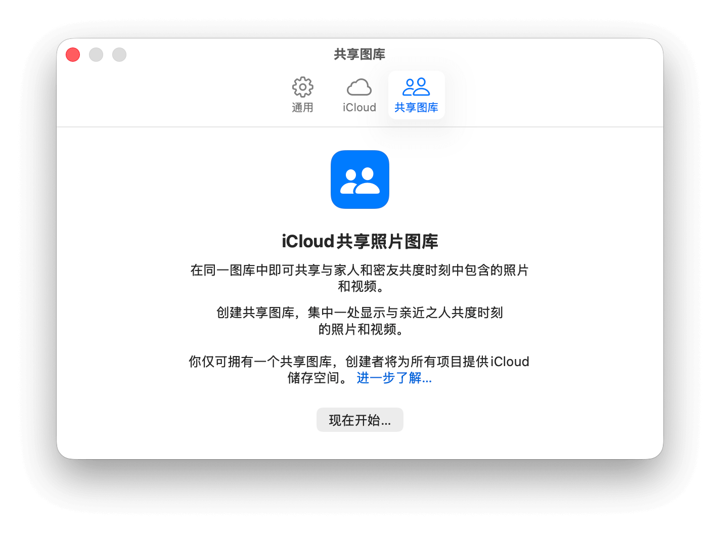 打开照片应用,使用快捷键 `Command + ,` 或通过菜单栏进入「照片」>「设置...」,切换到「共享图库」标签页,点击「现在开始」即可进行设置。