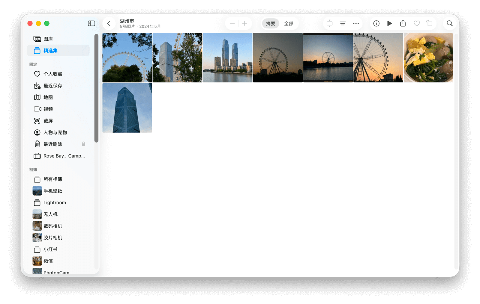 以「旅程」精选集为例,照片应用会将图库中所有的旅行照片按时间、地点分类整理,并创建出不同的精选集。在每个精选集中,你可以在「摘要」和「全部」两种视图间切换,也可以直接「播放幻灯片放映」,即刻重温身临其境的旅行回忆。
