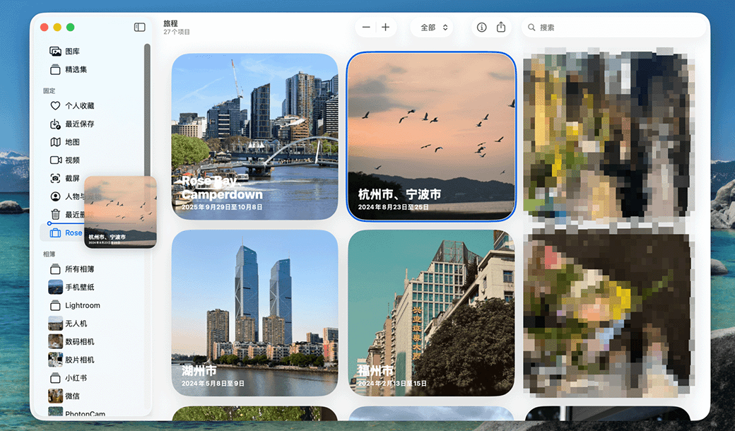 因为这些精选集是根据图库照片自动生成的,所以当图库内容变化时,精选集也可能随之改变。如果你想长久保留或方便浏览某个喜欢的精选集,可以直接将其拖拽到侧边栏的「我的相簿」下。此时,照片应用会自动创建一个同名相簿,并导入该精选集中的所有照片。