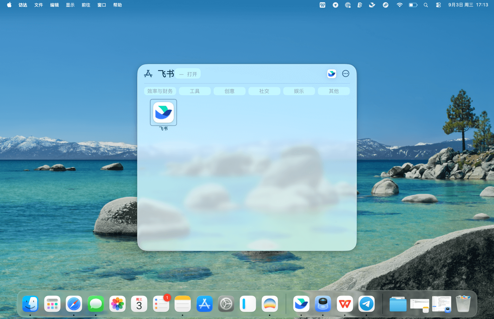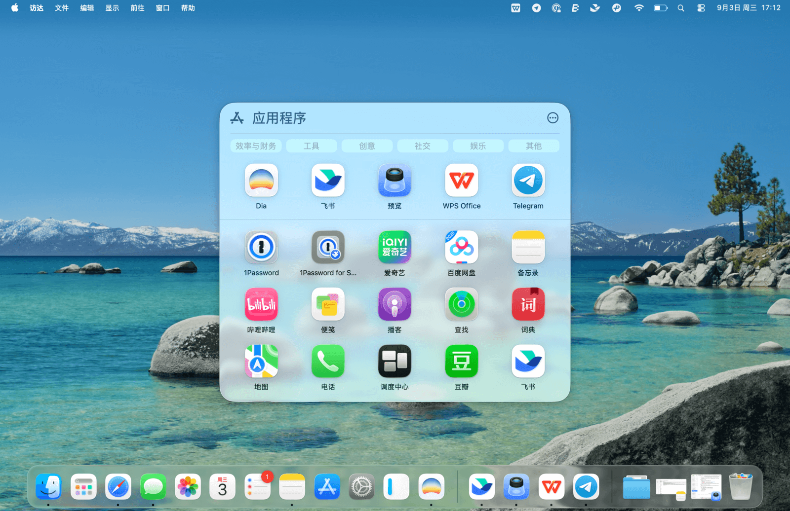 陪伴 Mac 用户多年的启动台(LaunchPad)在 macOS Tahoe 中被全新的 App 界面所替代,其功能也更紧密地融入了聚焦搜索。App 界面可以粗略地理解为类似安卓系统的应用抽屉,你可以通过它轻松找到并打开 Mac 上的 App。不过,它不支持手动排列 App 或将 App 整理到文件夹中,所有应用程序图标均由系统自动排列和分类,但可以通过顶部的类别按钮进行快速筛选。