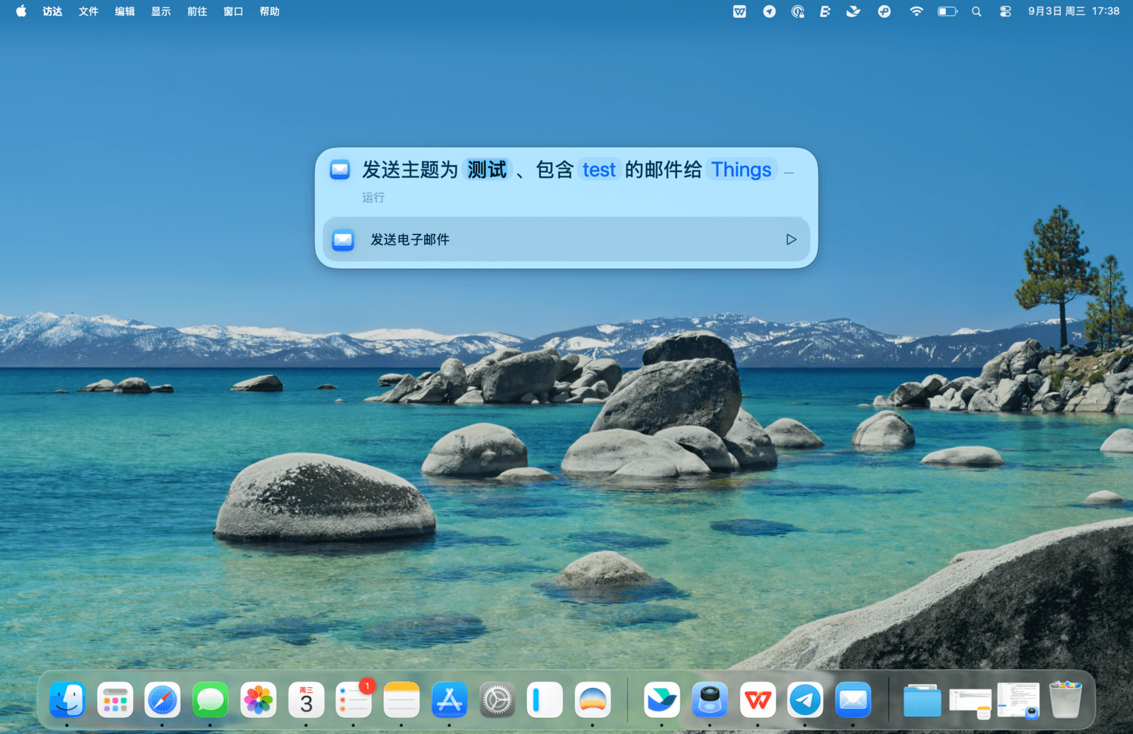 在 macOS Tahoe 中,聚焦的快速操作功能更进一步,不仅兼容了更多系统应用的操作,还支持在搜索栏中直接编辑参数。例如,在调用「发送电子邮件」这一操作时,可以直接填写主题、正文和收件人,填写完毕后无需跳转到邮件 App 即可完成发送。