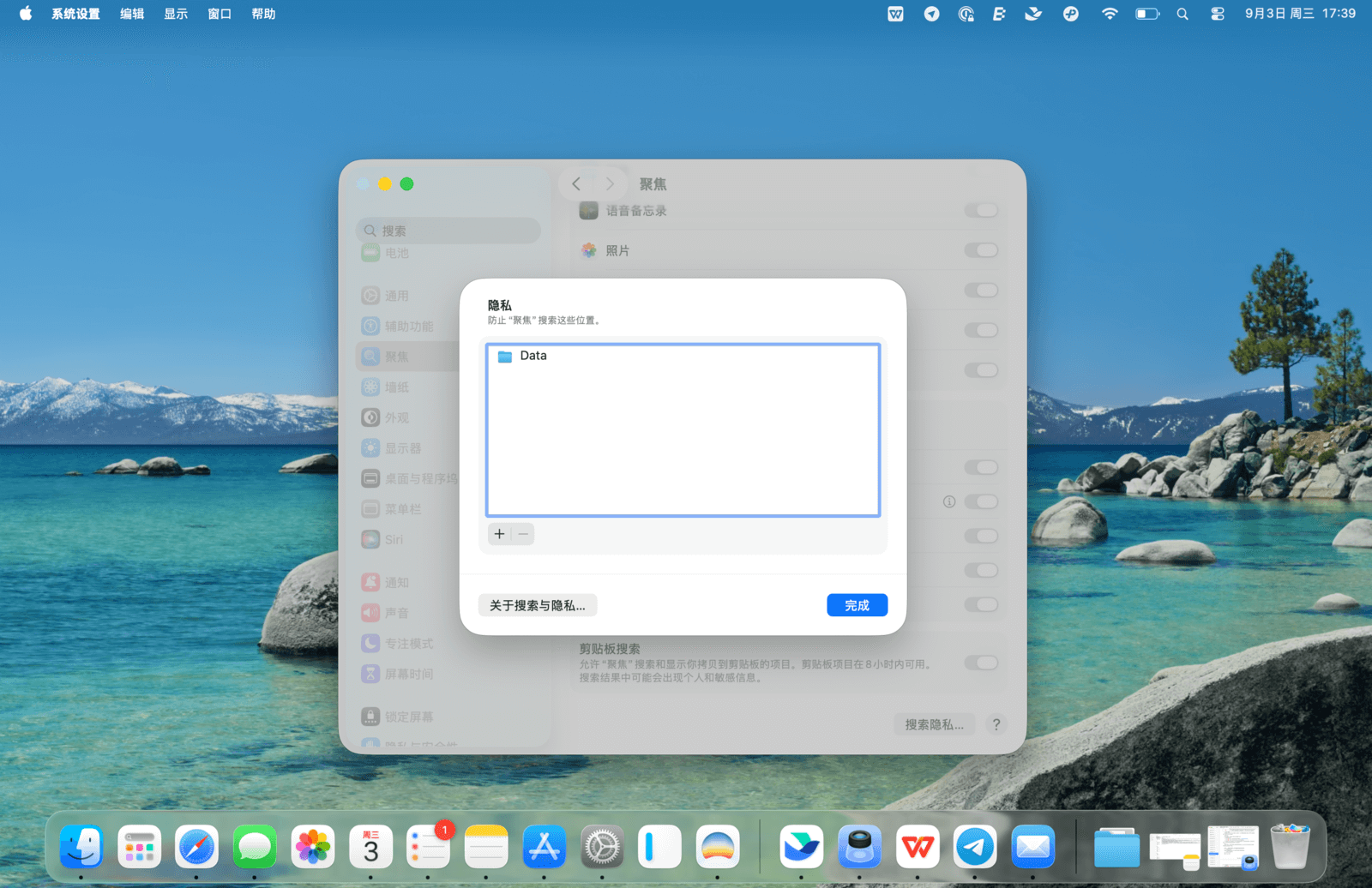 在「搜索隐私」面板中添加的文件夹将不会出现在聚焦的搜索结果中,从而确保个人隐私不会在无意间泄露。