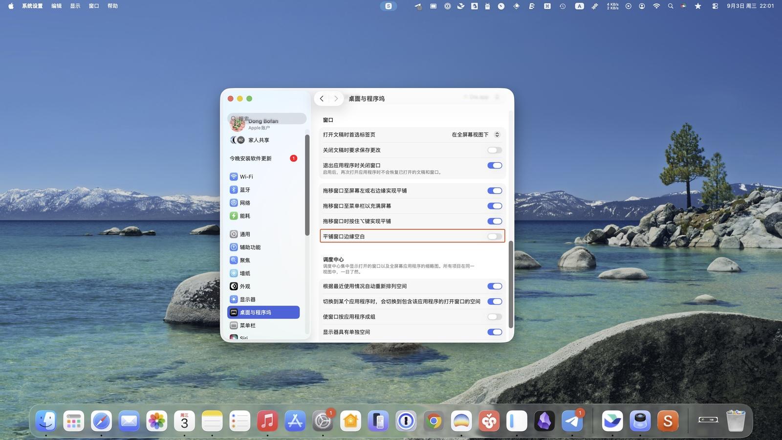 「平铺窗口边缘留白」选项在默认情况下也是开启的。这意味着,当我们通过拖动、点击绿色按钮或使用菜单栏等方式平铺窗口时,系统都会在窗口边缘保留一定的空白,使布局看起来更加整洁美观。当然,如果你希望窗口铺满整个桌面,只需关闭该选项即可。