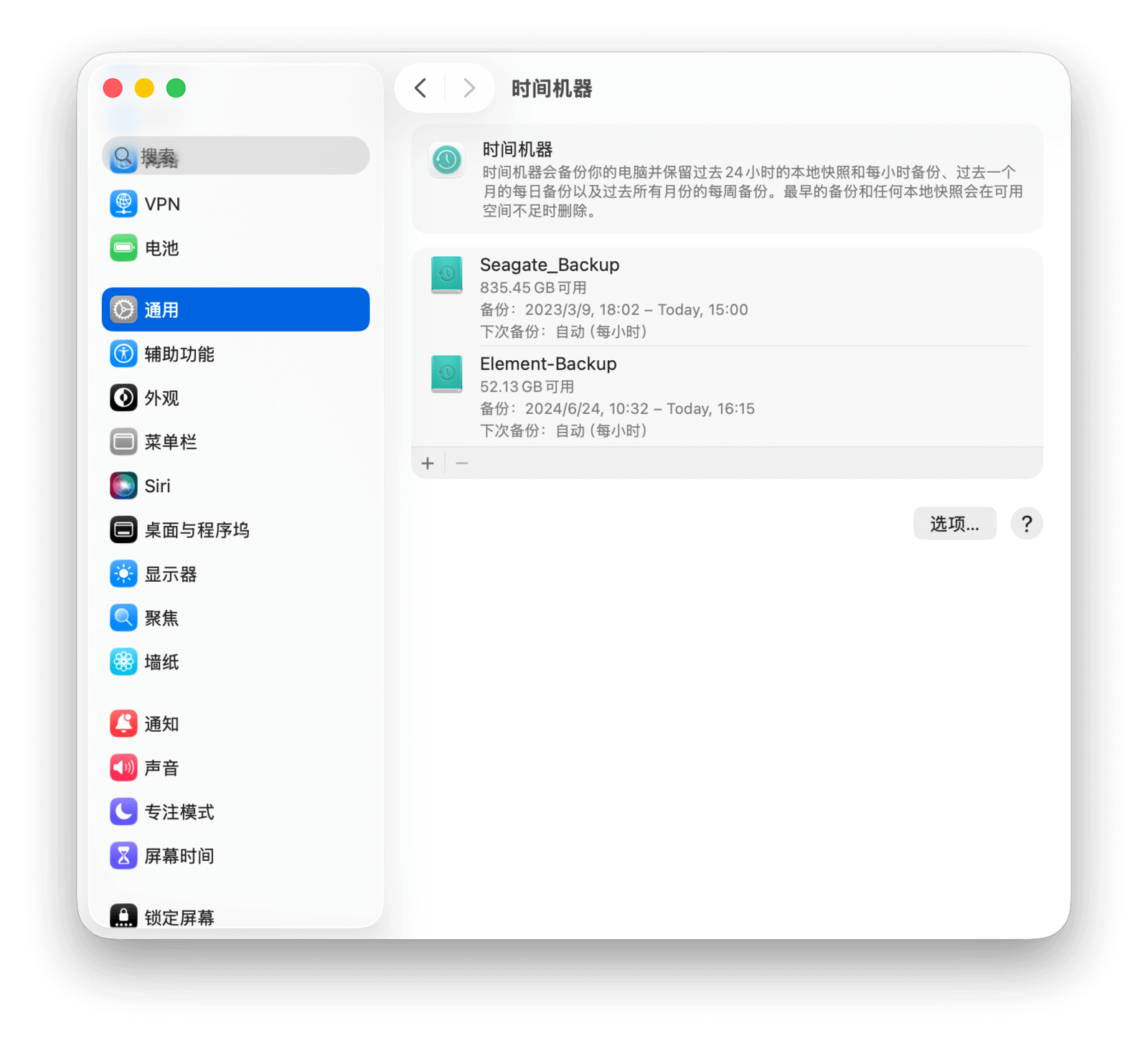 如果你想让 Mac 在备份时跳过某些特定文件或文件夹,可以点击「系统设置 > 通用 > 时间机器」面板右下角的「选项…」按钮,在弹出的菜单中添加不想备份的项目。